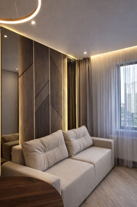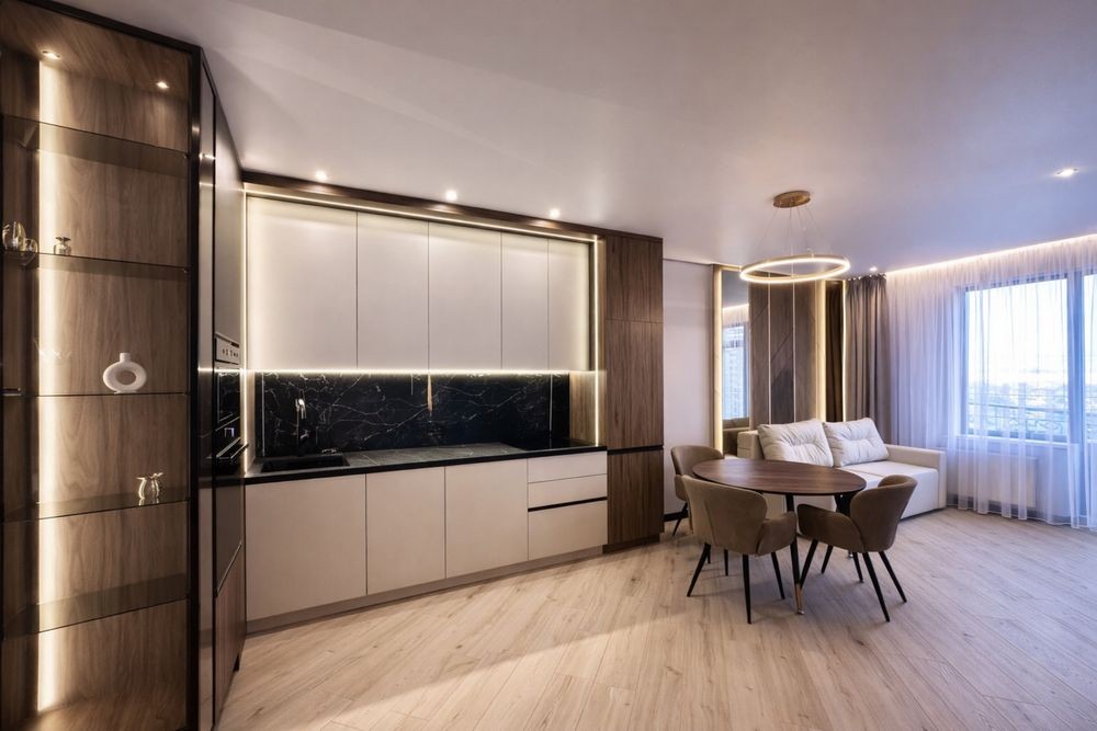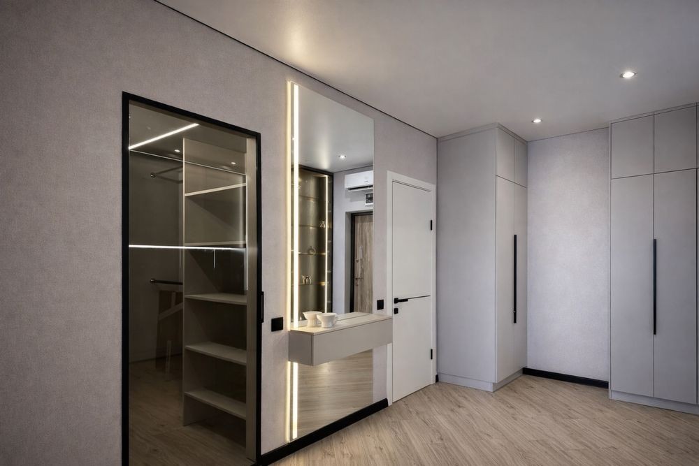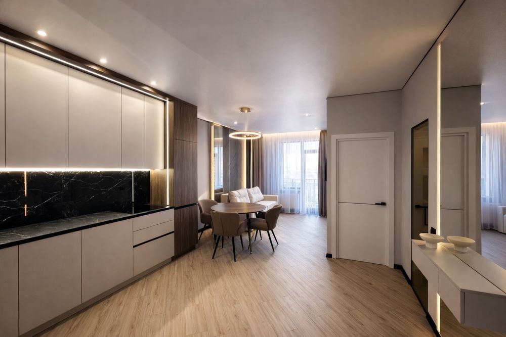 просторная кухня-гостиная с выходом на балкон, отдельная спальня, гардеробная и ванная комната.