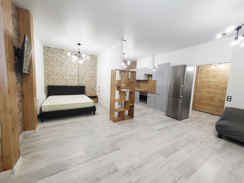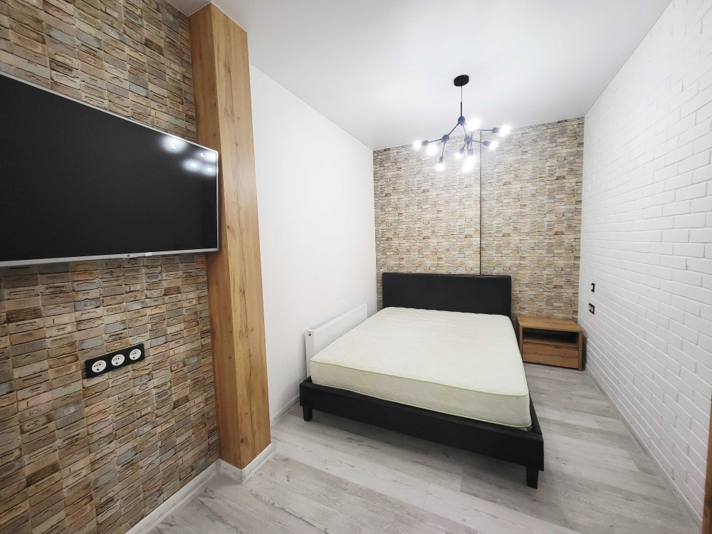 Планування : квартира зонована на 3 частини— спальня з ліжком і матрацом, вітальня з диваном і телевізором, кухня з усією необхідною технікою.