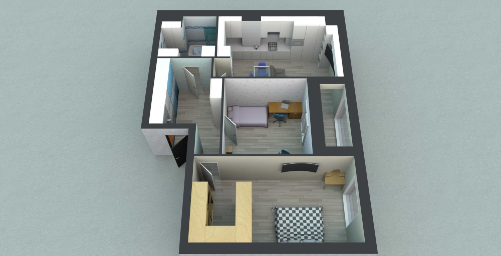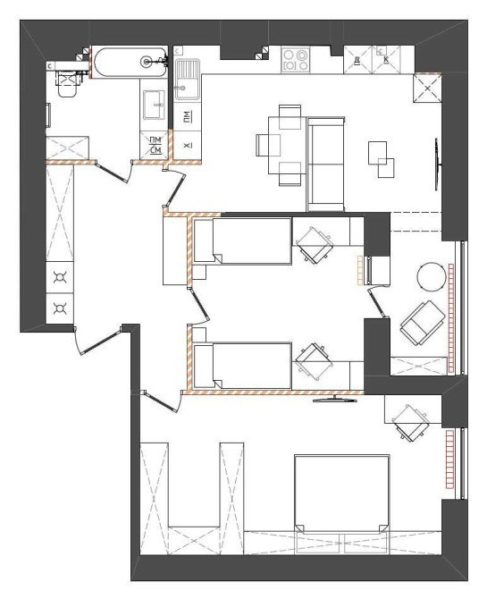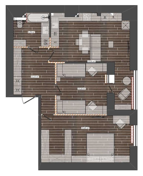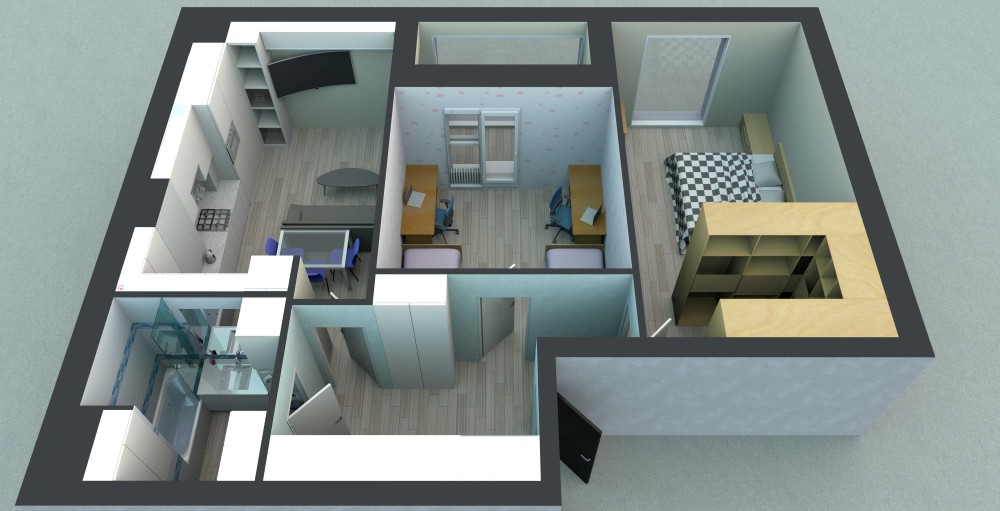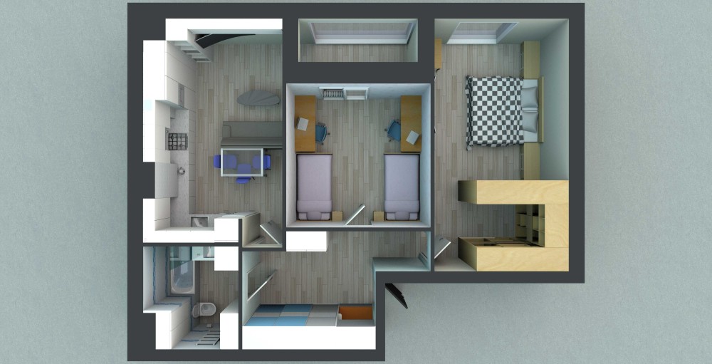 Дві просторі кімнати, простора кухня-студія, простора вітальня та великий санвузол. Можна приєднати або відокремити лоджію. Достатньо вільного місця під шафи.