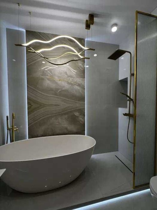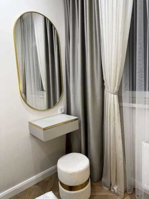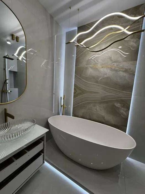 Інтер'єр доповнює окремо стояча ванна зі штучного каменю — виразний акцент, що підкреслює естетику і рівень комфорту. Квартира повністю укомплектована меблями і технікою Whirlpool і Gorenje.