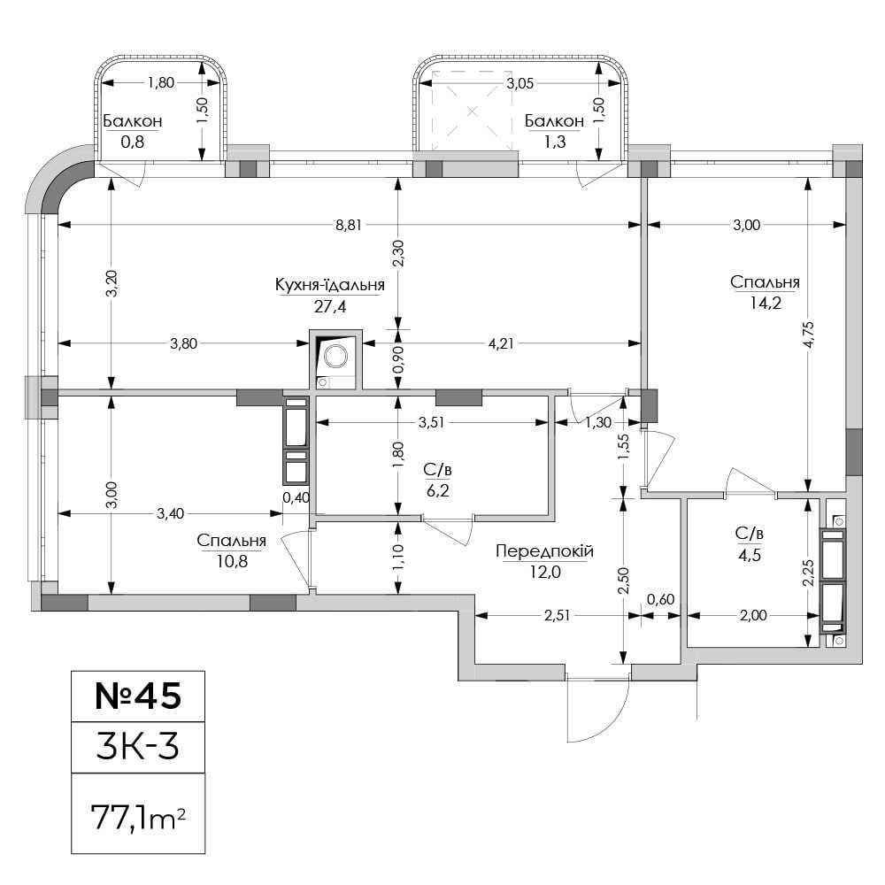 • Общая площадь 77.1 м2
