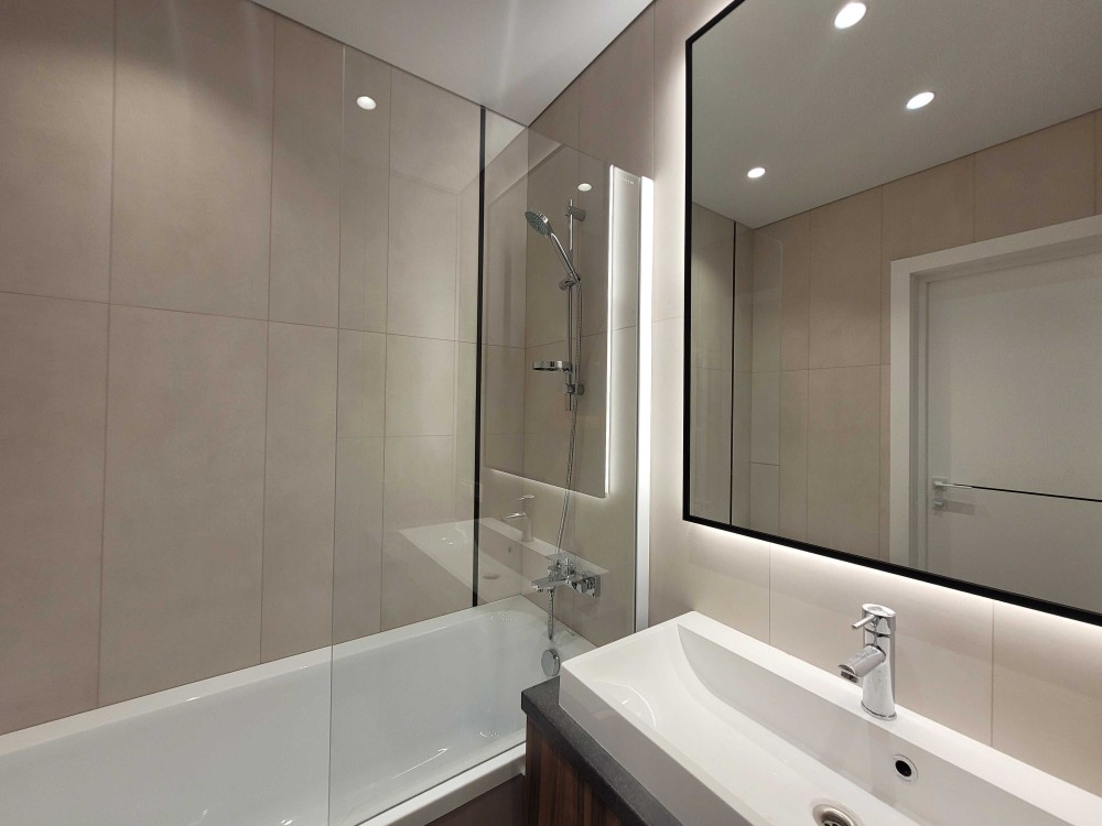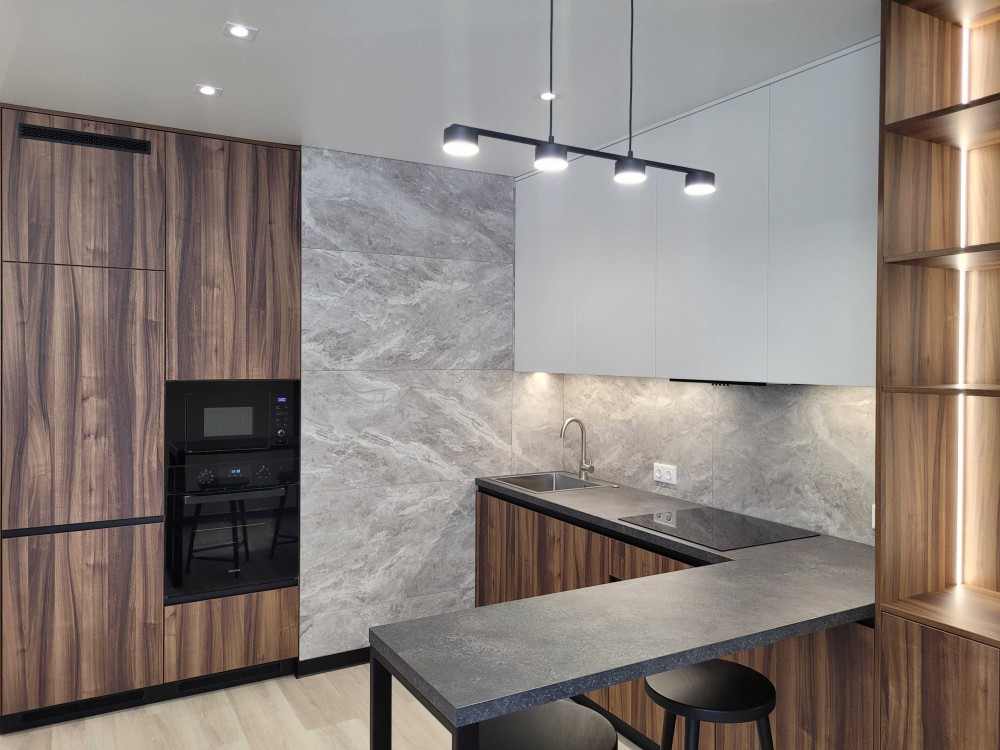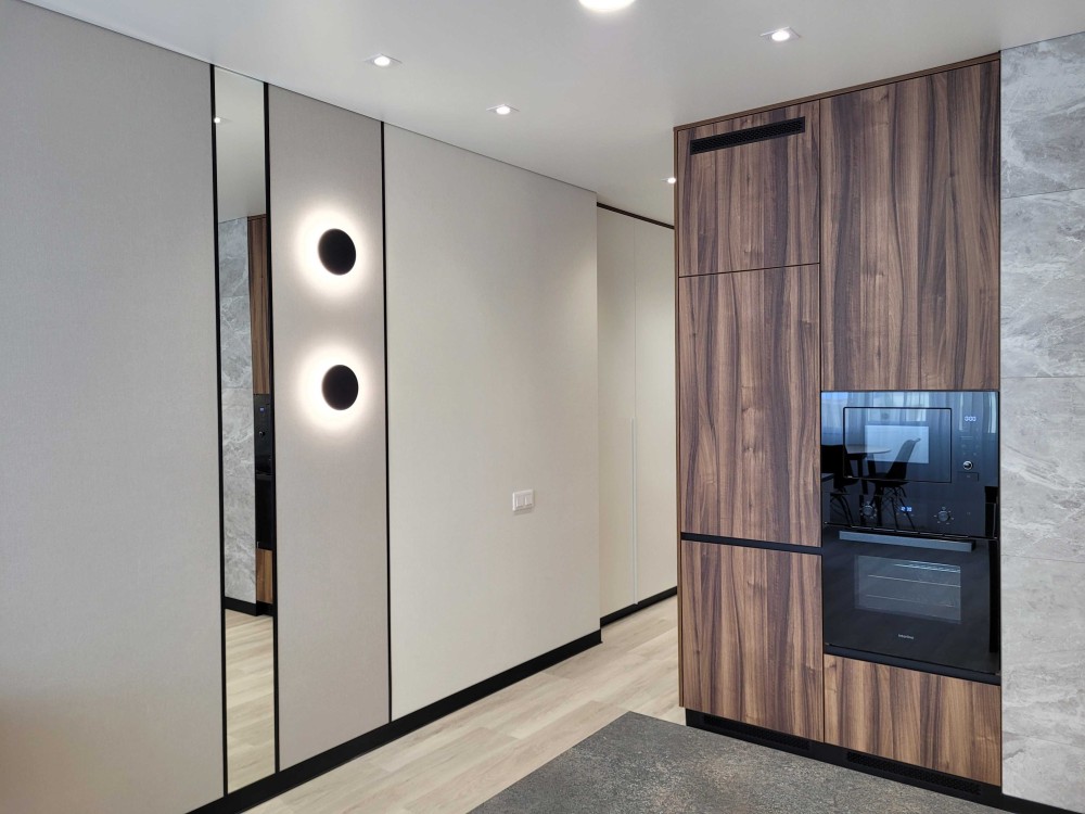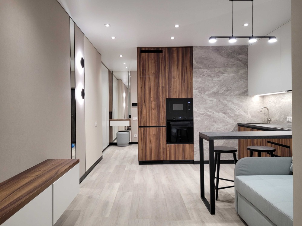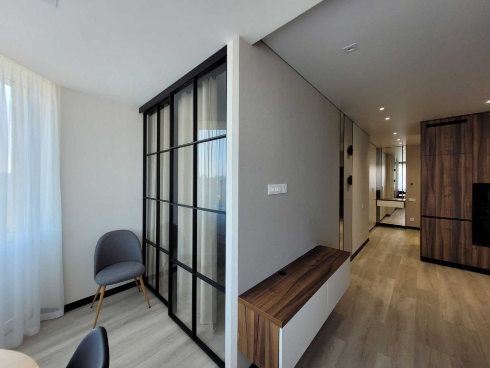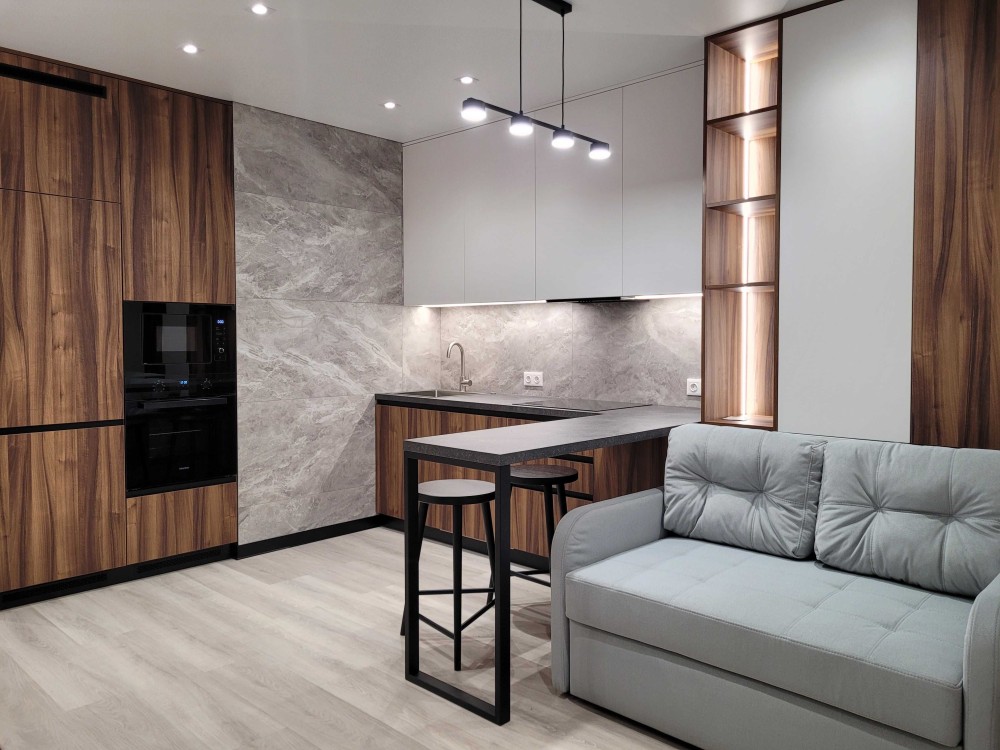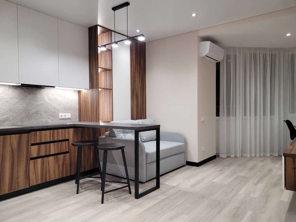Зроблено дизайнерський ремонт з розділенням на окрему зону відпочинку та вітальню, що поєднується з кухнею.