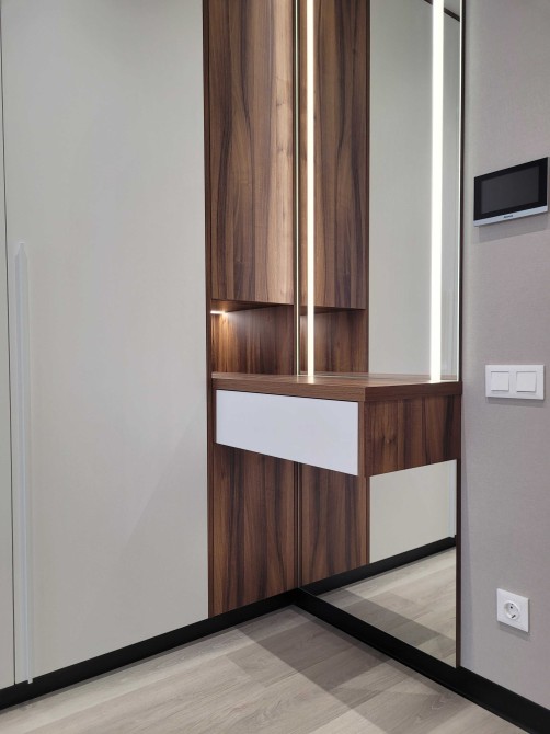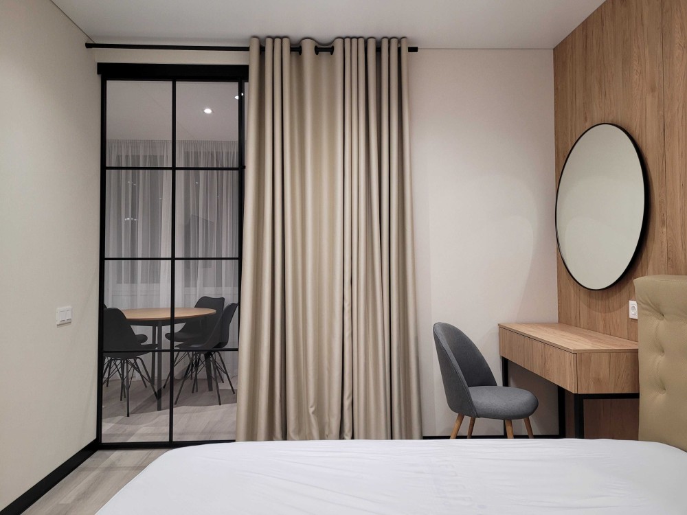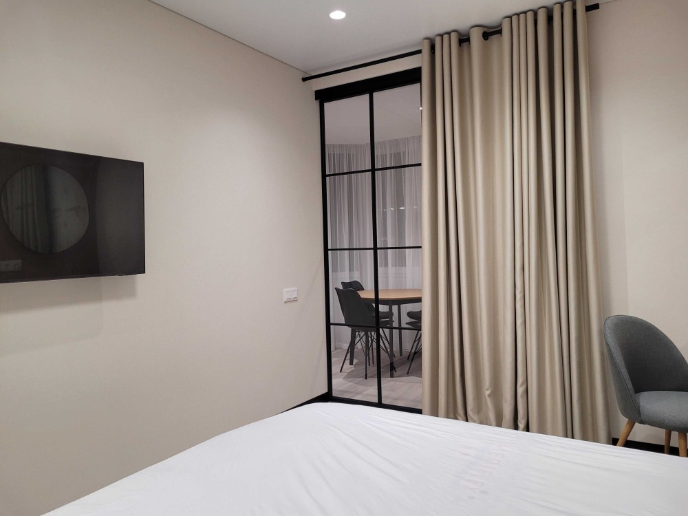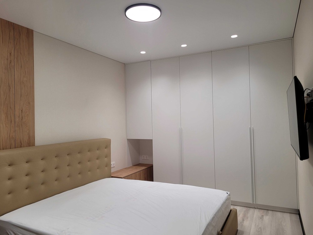 Квартира облаштована сучасними меблями, а саме: містка шафа-купе при вході та в спальні, повноцінним двоспальним ліжком з ортопедичним матрацом, диваном, барною стійкою, вбудованою кухнею.
