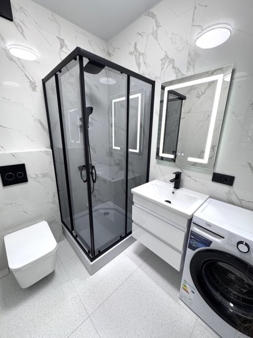 В квартирі є посудомийка, пралка, витяжка, душова кабіна, дзеркало з підсвіткою та обігрівом, шафи та тумби, тепла підлога, все для вашої зручності та затишку