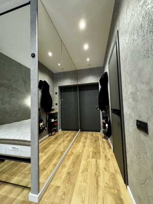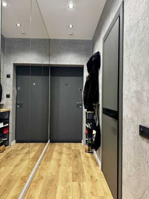 Передпокій із нішою для взуття, величезне дзеркало на всю стіну.