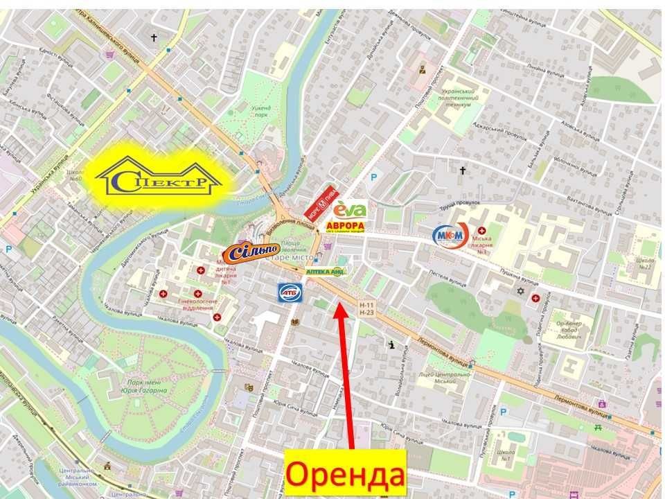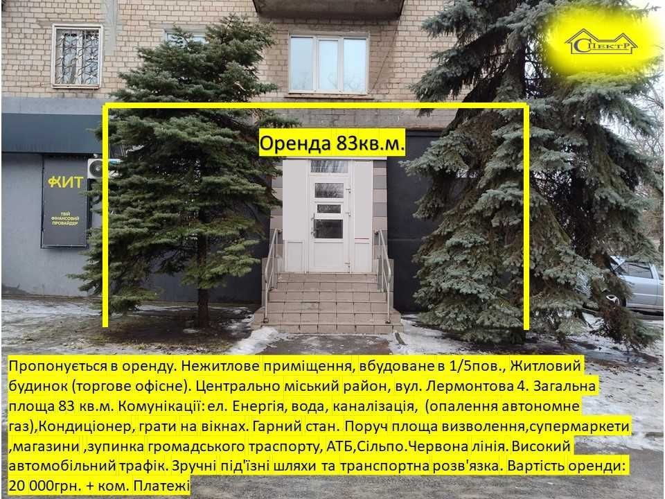 Пропонується в оренду. Нежитлове приміщення, вбудоване в 1/5пов., Житловий будинок (торгове офісне). Центрально міський район, вул. Лермонтова 4. Загальна площа 83 кв.м. Комунікації: ел. Енергія, вода, каналізація, (опалення автономне газ),Кондиціонер, грати на вікнах. Гарний стан. Поруч площа визволення,супермаркети ,магазини ,зупинка громадського траспорту, АТБ,Сільпо.Червона лінія. Високий автомобільний трафік. Зручні під'їзні шляхи та транспортна розв'язка. Вартість оренди: 20 000грн. + ком. Платежі