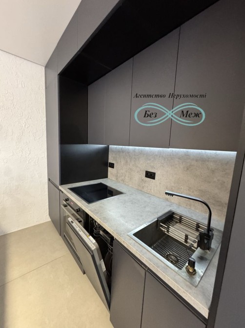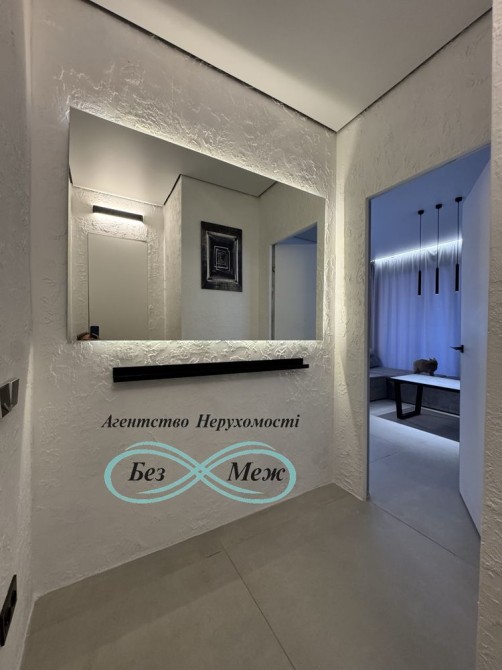 Інтер’єр виконаний у сучасному стилі: парящі стелі з LED-підсвіткою, широкоформатний керамограніт, тепла підлога з керуванням зі смартфона.