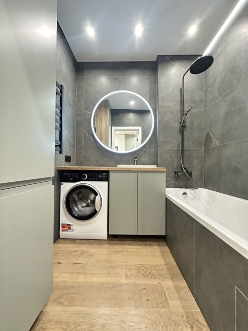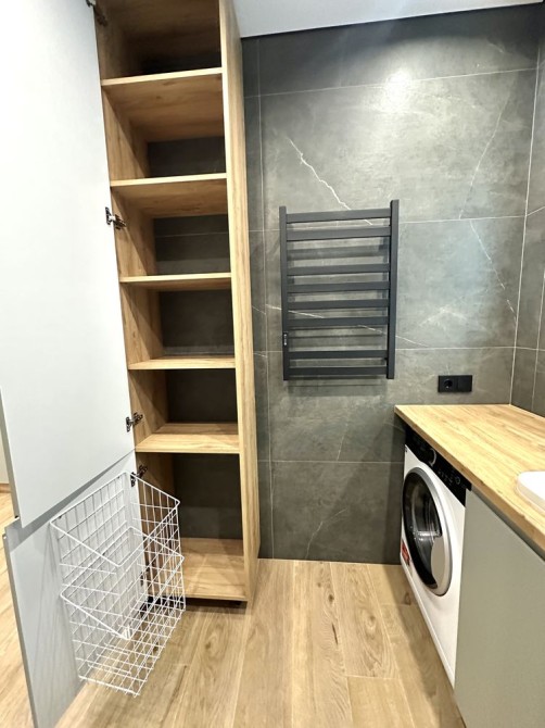 • Роздільний санвузол. Ванна облаштована раковиною та вже є пральна машинка. Зручна шафа для ванного приладдя та вмонтована корзина для білизни.