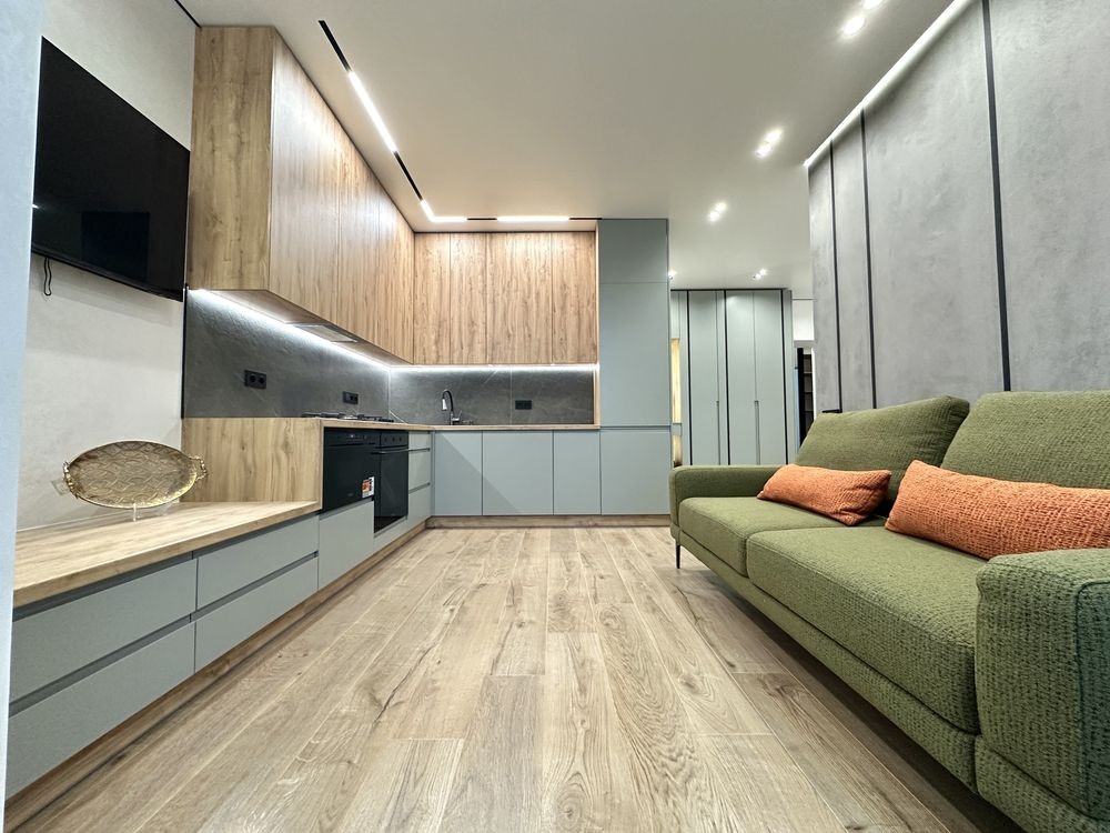 • Кухня укомплектована всією необхідною кухонною технікою, а саме: посудомийна машина, духова шафа, мікрохвильова піч, холодильник. Є велика плазма та диванчик, що розкладається.