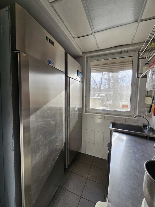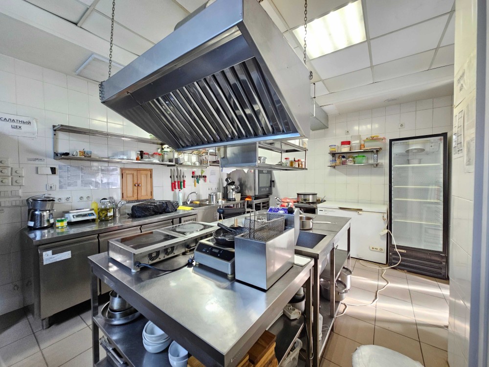 В помещении 2 санузла, всего предусмотрено 7 мокрых точек — 5 моек и 2 умывальника в санузлах. Санузлы облицованы плиткой, всё оборудование находится в рабочем состоянии. Установлена приточно-вытяжная вентиляция, тепловая завеса, 2 кондиционера. Есть отдельный ввод 380 В, мощность 50 кВт.