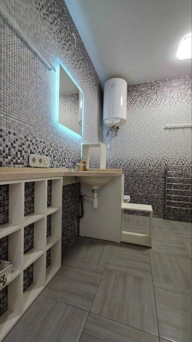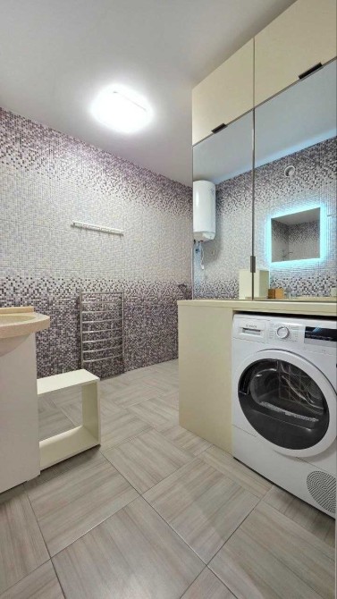 - Санвузол просторий, із великою душовою зоною та зручними системами зберігання, є пральна та сушильні машини. Уся сантехніка від провідних європейських виробників. Для комфорту взимку працює тепла підлога від опалення.