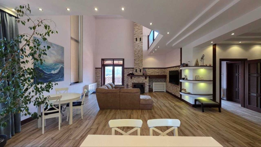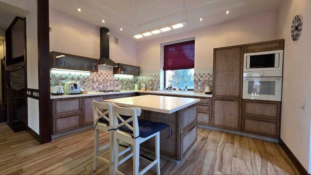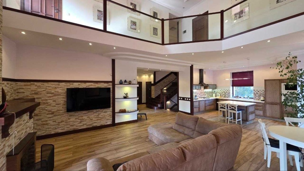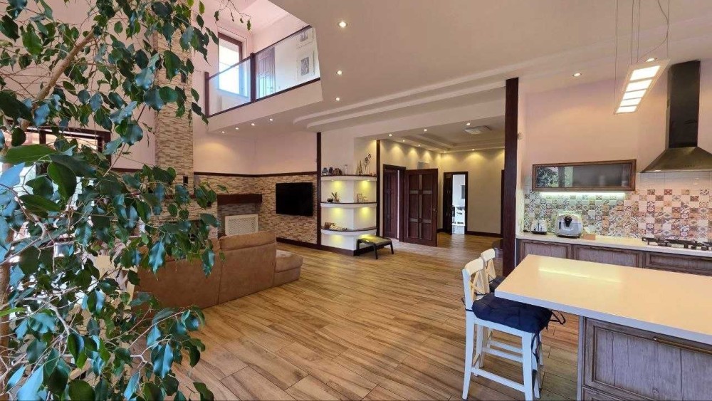 Будинок має загальну площу 300 м², де кожна зона продумана для зручного щоденного життя. Просторе планування включає велику кухню-вітальню на першому поверсі — місце, де поєднується обідня зона та зона відпочинку. Атмосферу доповнює камін, що додає тепла й затишку в холодну пору.