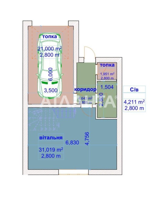 Площа - 130 м², три кімнати, кухня студія, закритий гараж, підсобне приміщення, 2 санвузли.