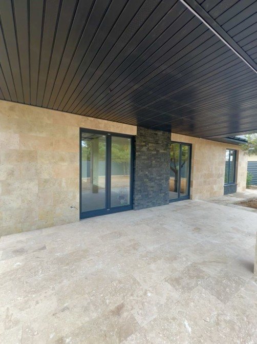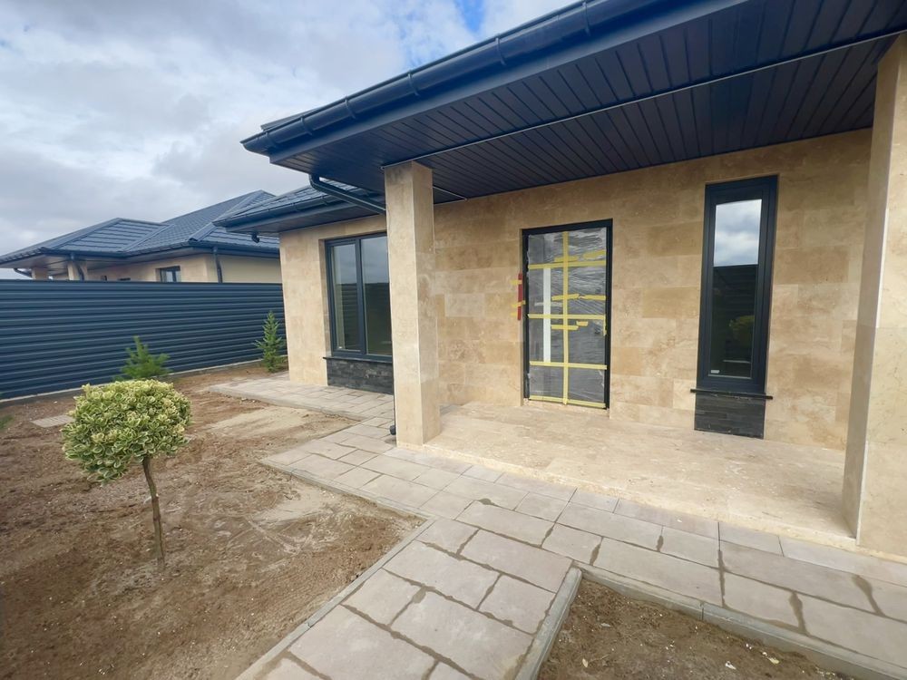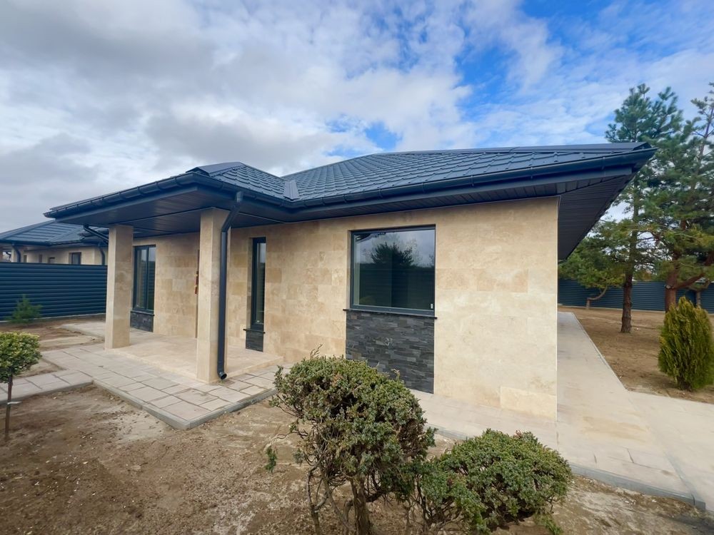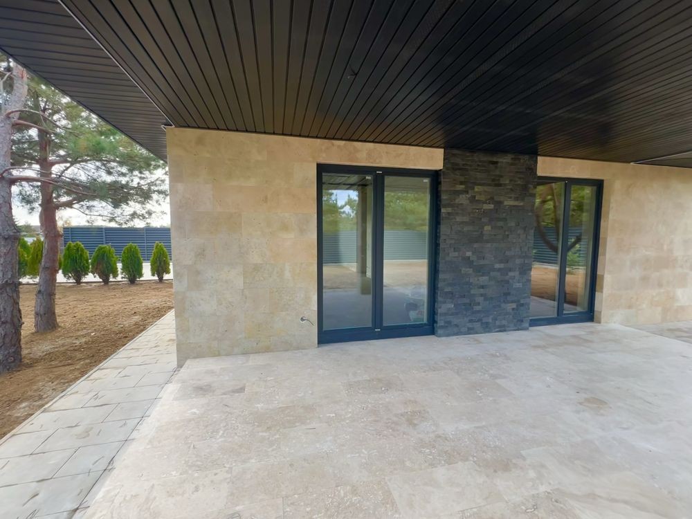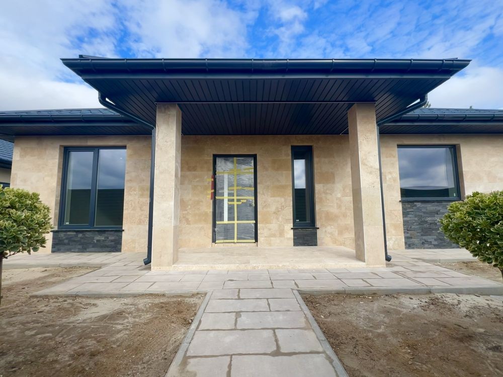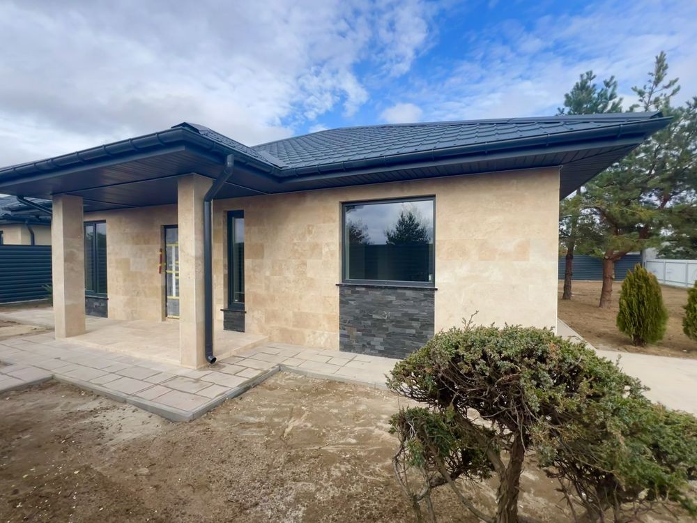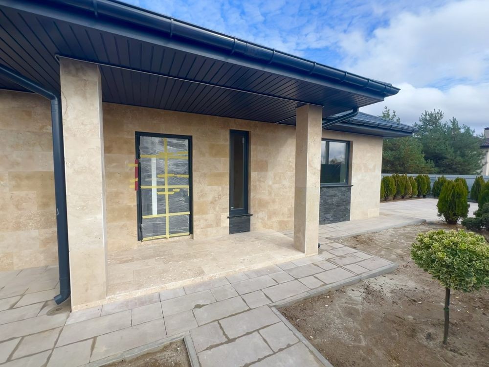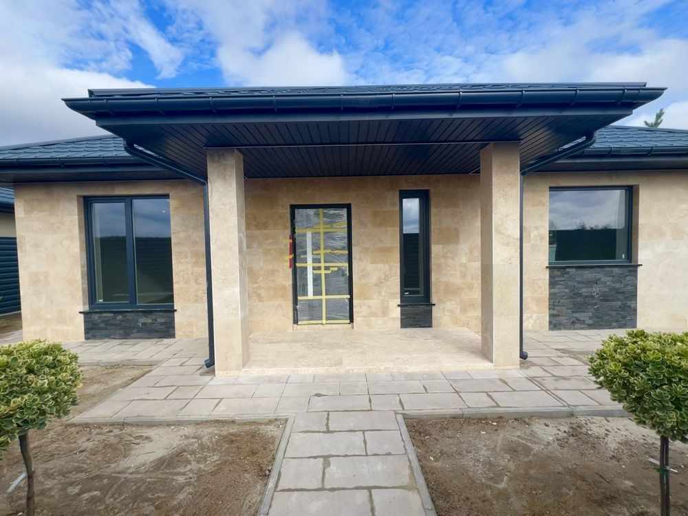 Фасад оздоблений натуральним турецьким травертином із декоративними вставками з чорного сланцю.