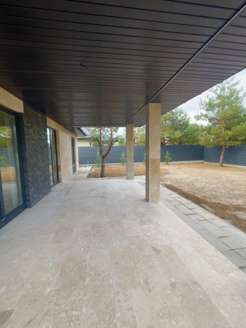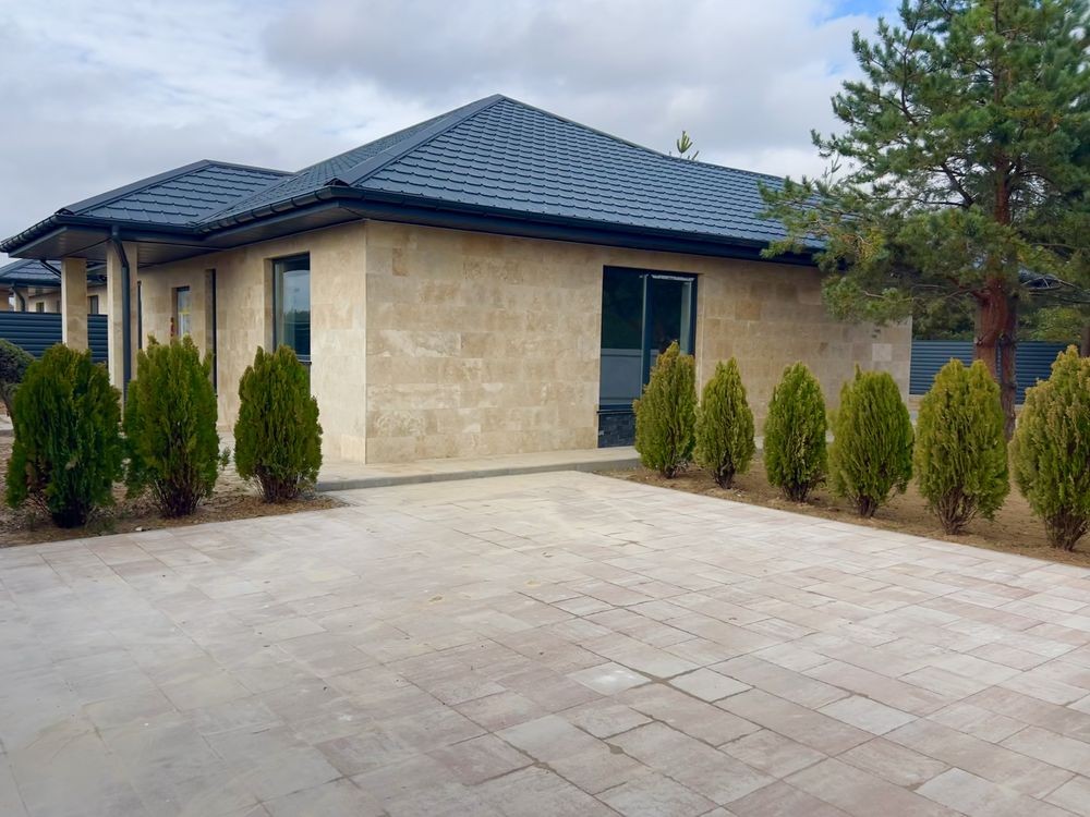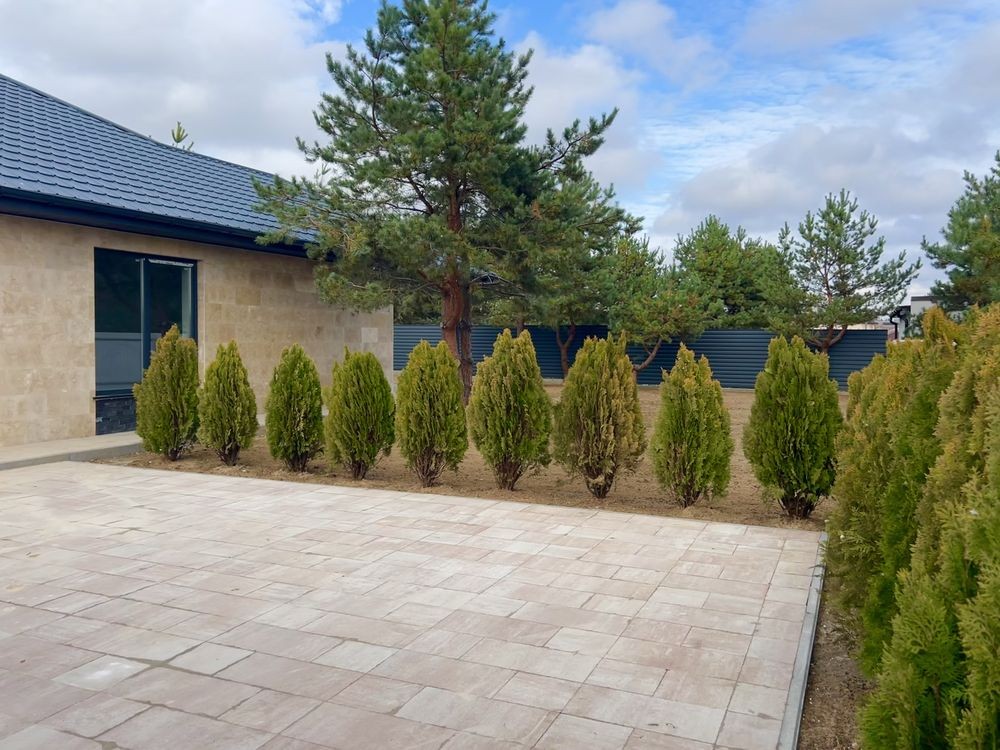 Тераса, доріжки, вимощення та паркувальна зона на 2 авто (49 м²) викладені травертином і тротуарною плиткою.