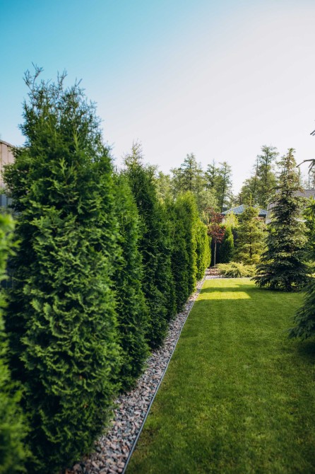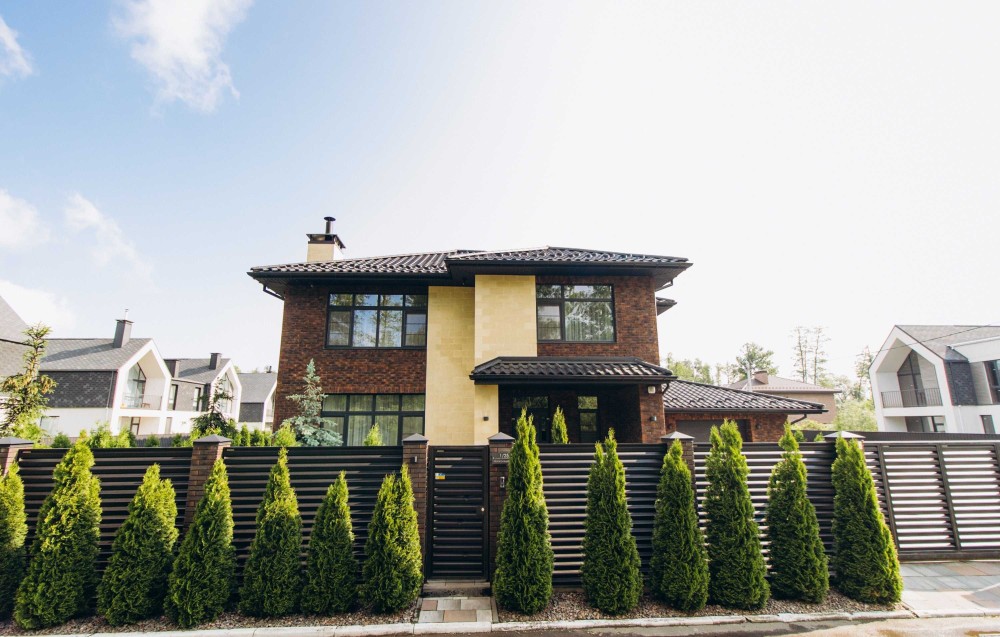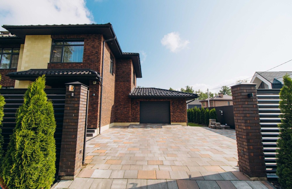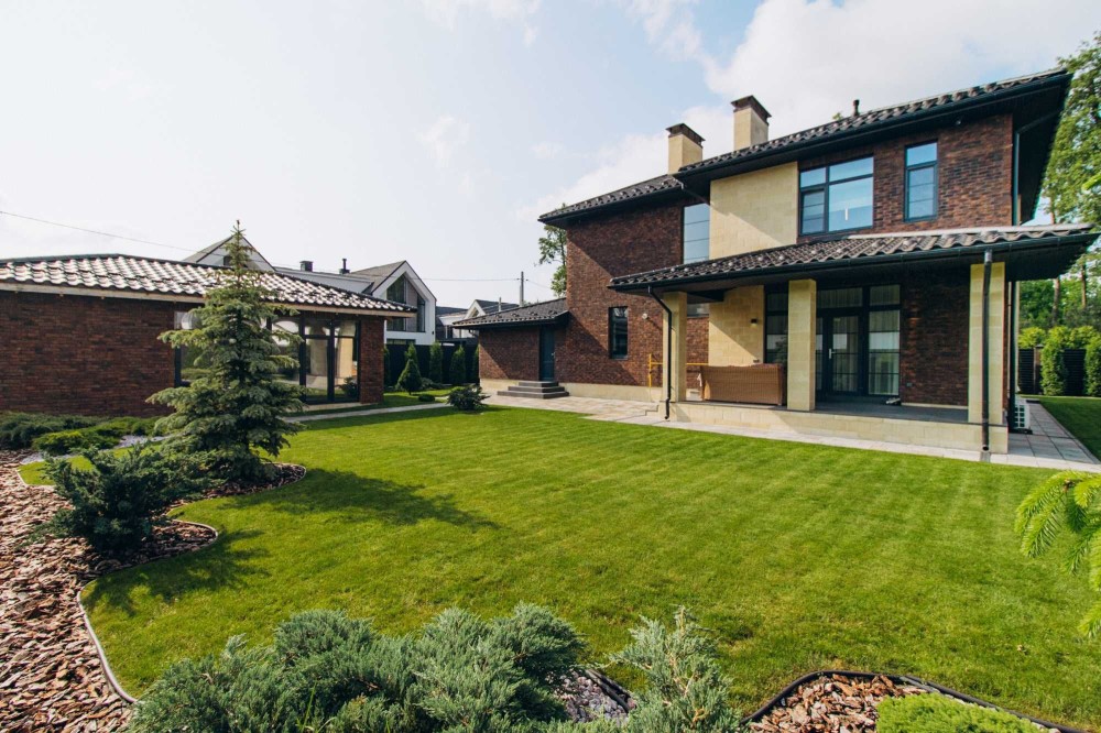 Ділянка 10 соток — озеленена за ландшафтним проєктом, розведено автоматичний полив, мощення плиткою, огорожа, автоматичні ворота, сучасне освітлення.