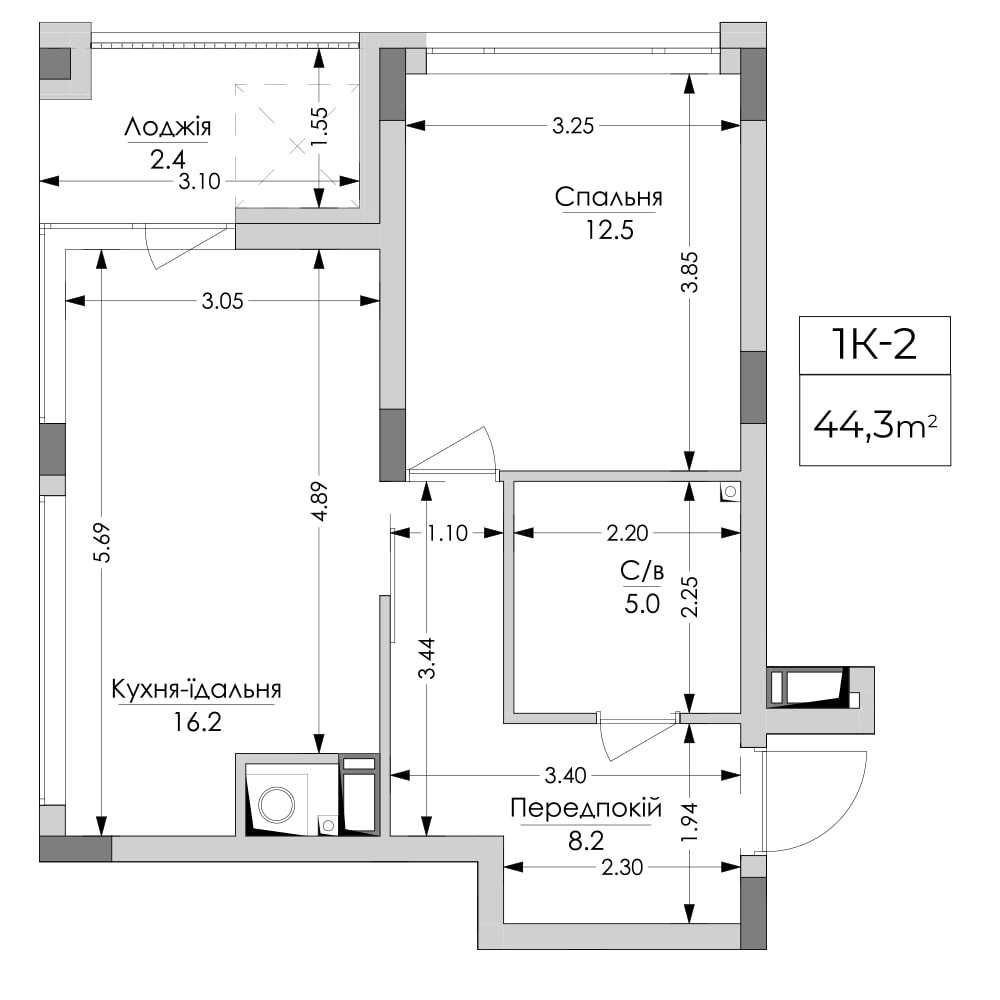 • Общая площадь 44.3 м2