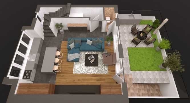 Два жилых этажа со свободной планировкой, на первом кухня-гостиная и санузел, на втором две спальни и санузел.