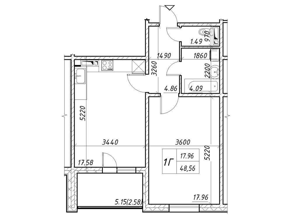 1к квартира 48.24м2 з великою кухнею та просторою житловою кімнатою!