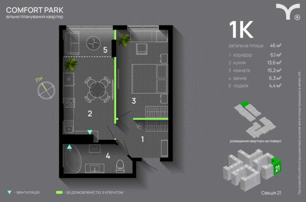 Комплекс знаходиться біля лісопаркової зони — ідеальне місце для прогулянок та активного відпочинку. Район з гарною екологією, без промзон і шумних доріг. Зручне транспортне сполучення: поруч зупинки громадського транспорту та швидкий доїзд до центру.