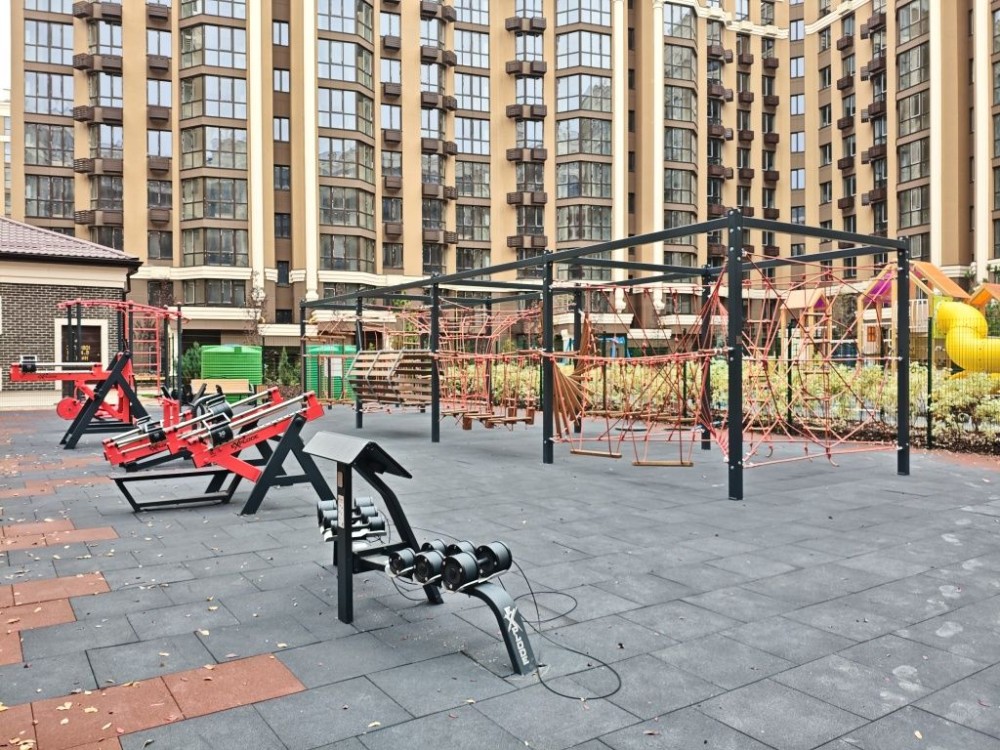 Біля будинку є повністю вся інфраструктура для комфортного життя не виїжджаючи з комплексу. Багато паркомісць, та зарядних станцій для електромобілів.