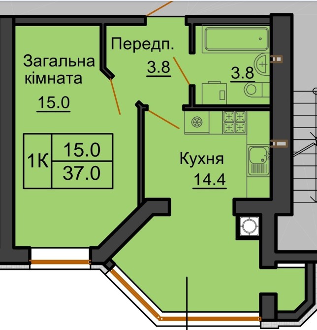 Квартира має загальний метраж 38 кВм, роздільна, має простору кухню з панорамним вікном, велику кімнату, місткий коридор, та суміжний санвузол.