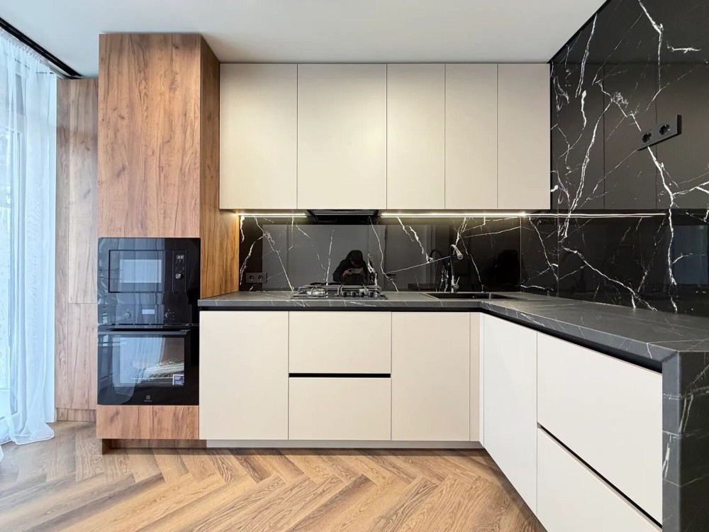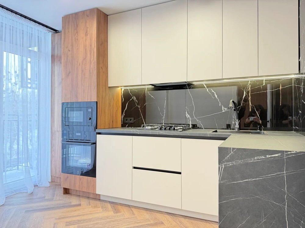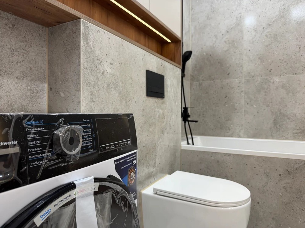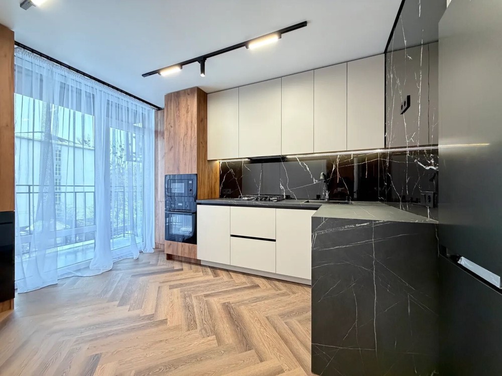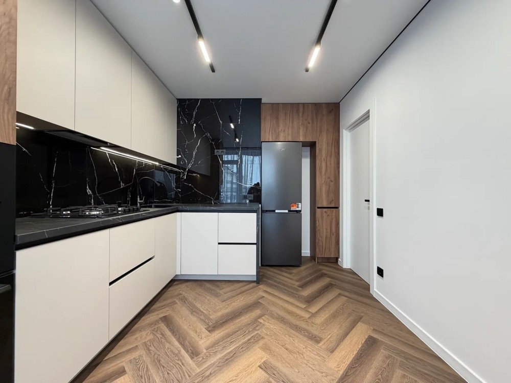 На кухні є посудомийна машина, холодильник, газова варильна поверхня, витяжка, духова шафа та мікрохвильова піч. Також при вході в квартиру встановлений кондиціонер який працює на обігрів та охолодження.