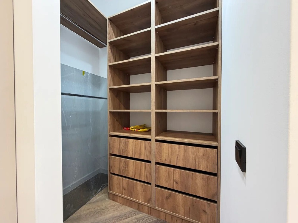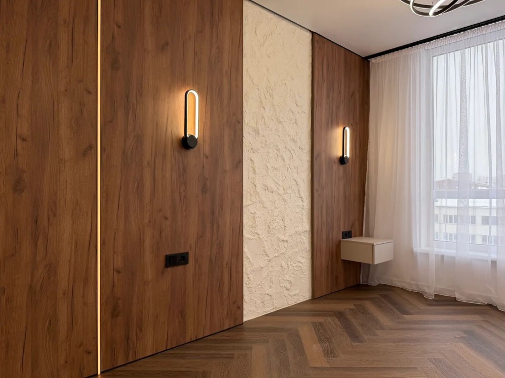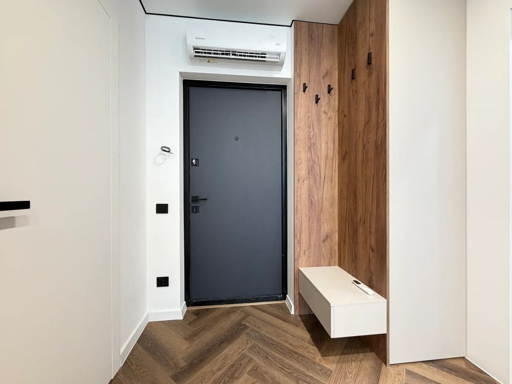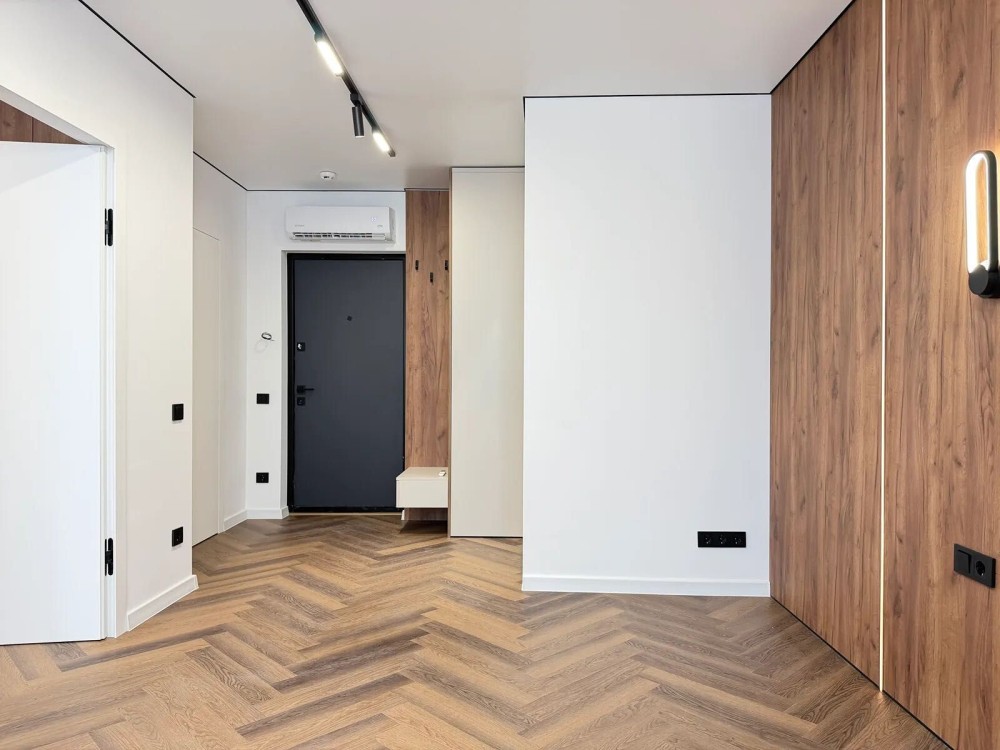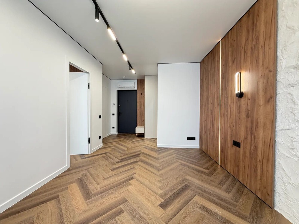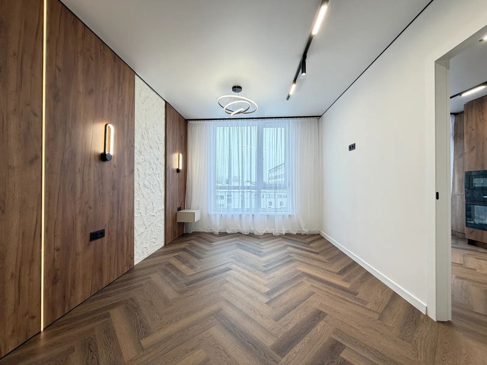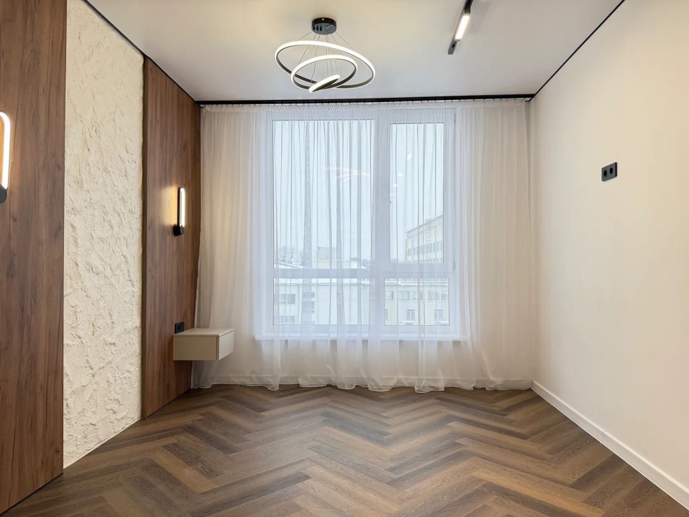 На підлозі встановлений кварцвініл та є підігрів підлоги по усій квартирі, в зоні спальні є двоспальне ліжко та є місце для телевізора та робочої зони.