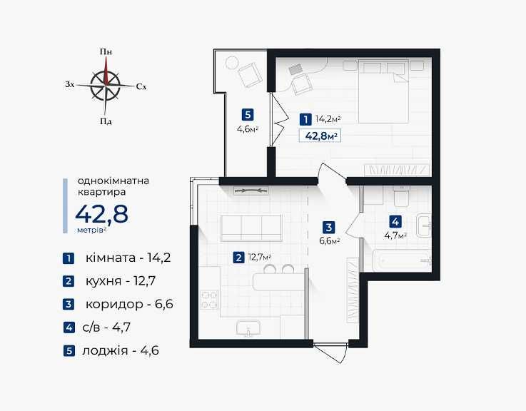 • Общая площадь 42.8 м2