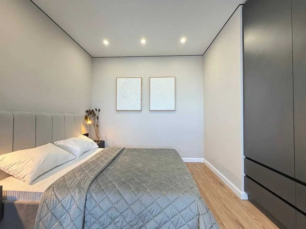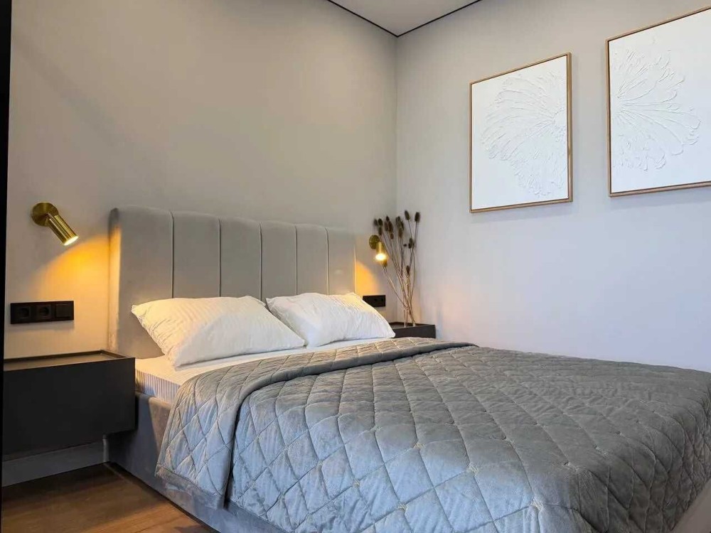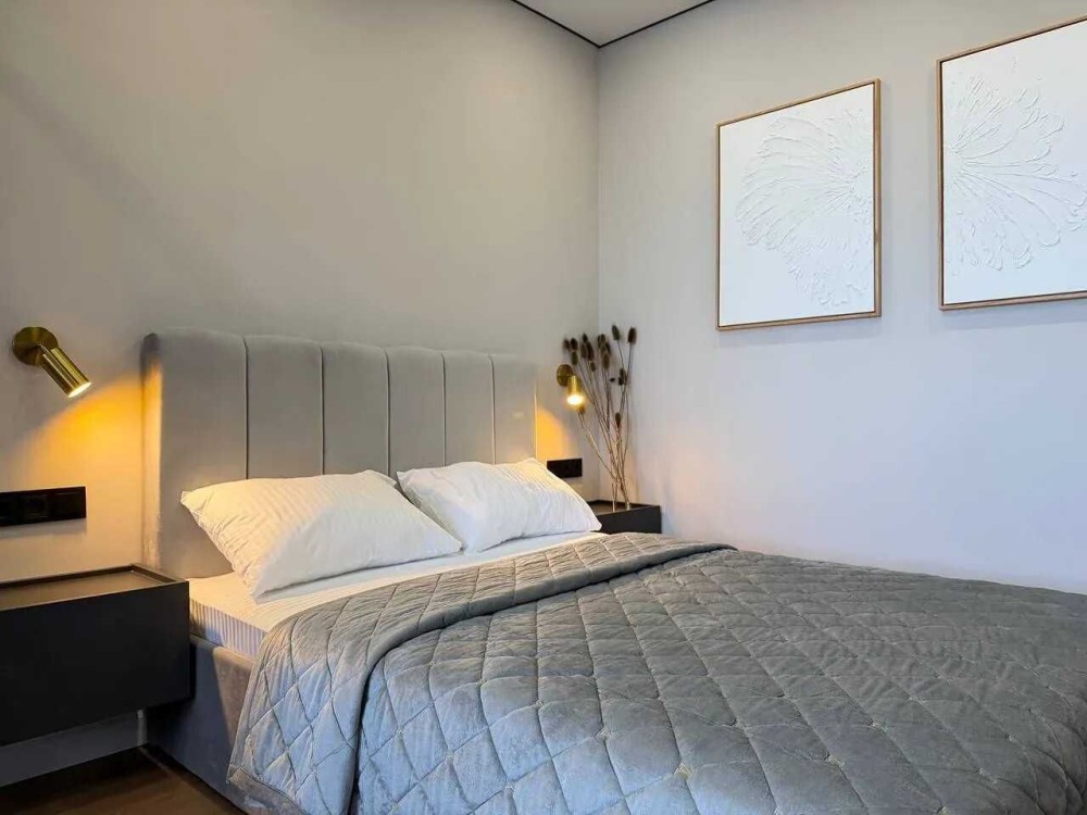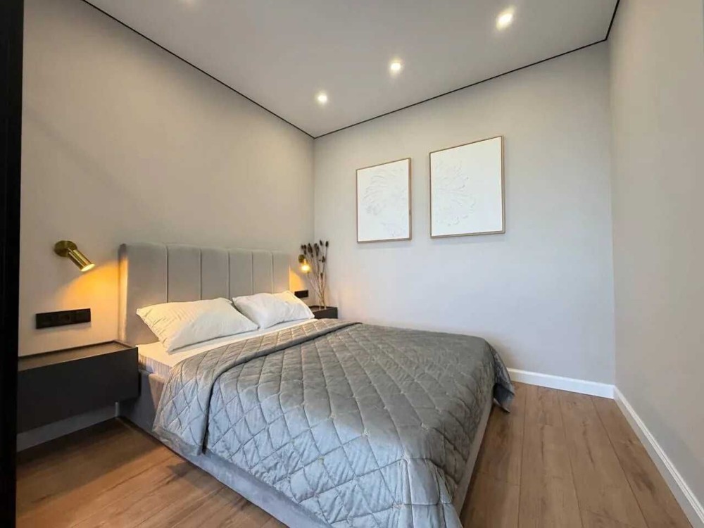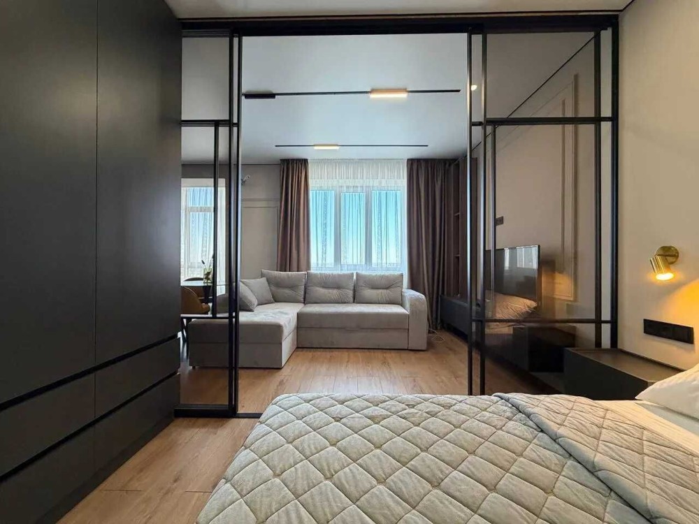 Квартира має функціональне планування, оскільки в ній є спальня, зона вітальні та простора кухня з виходом на лоджію.
