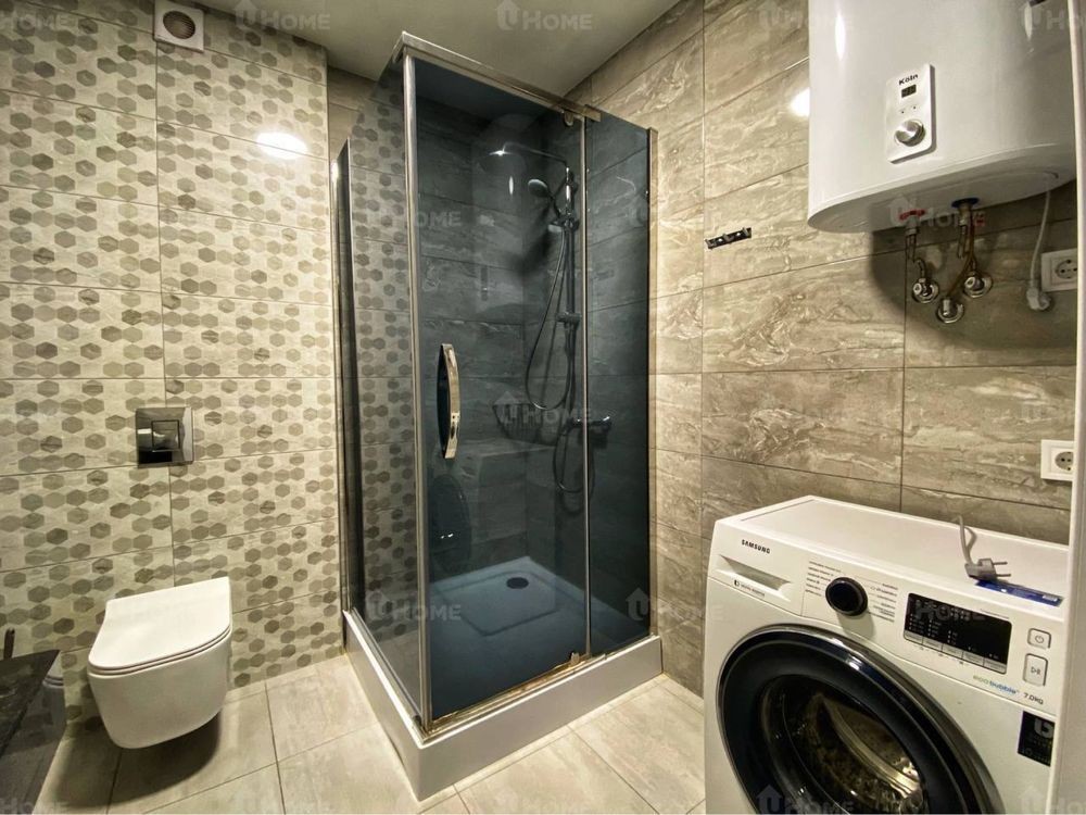 В санузле душевая кабина, бойлер, умывальник с зеркалом и стиральная машина.
