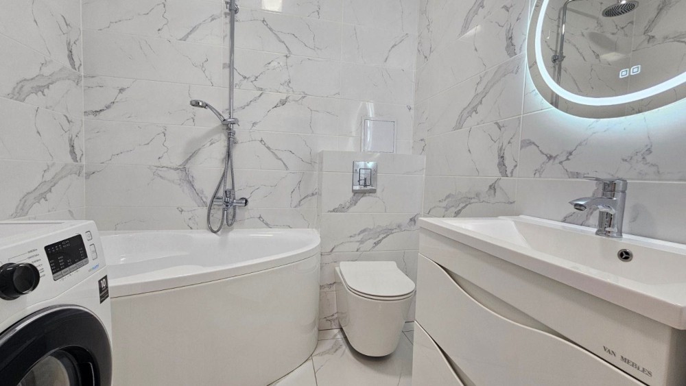 Обладнана пральною машиною, холодильник, плита, духова шафа, телевізор, кондиціонер, мікрохвильова піч. Інфраструктура: "Магазини, зони відпочинку та паркінг безпосередньо в ЖК.