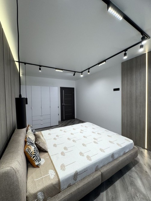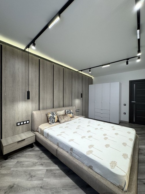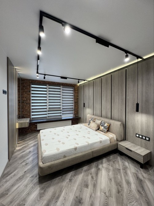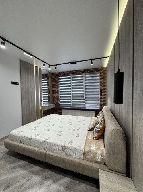 Наявні всі необхідні меблі: двоспальне ліжко, розкладний диван, робочий стіл, вмістимі шафи