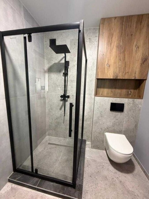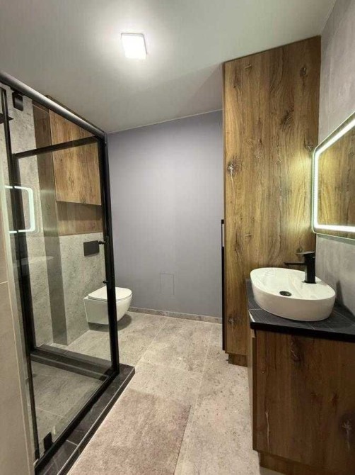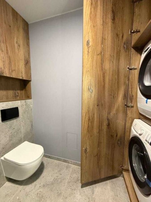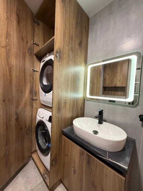 Сучасний санвузол із якісною сантехнікою, пральна машинка та сушильна.