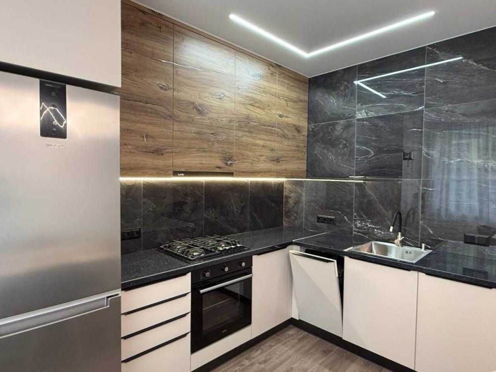 Простора кухня з новими меблями та технікою (холодильник, плита, витяжка, духова шафа, посудомийка, микрохвильова).