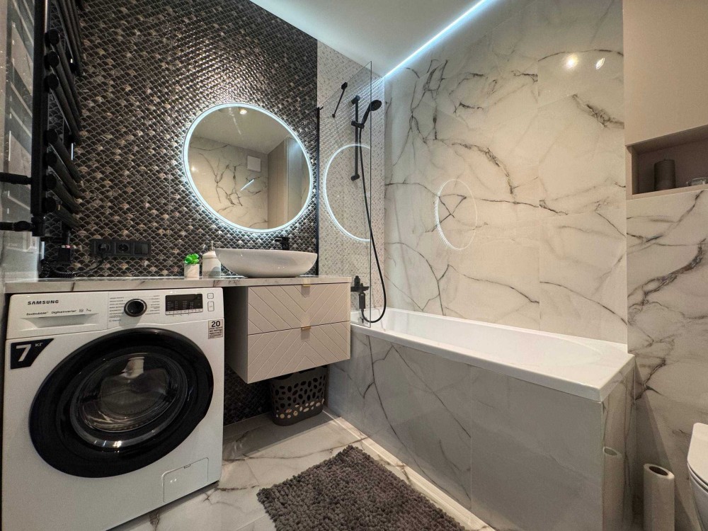• Санвузол з ванною: пральна машина, дзеркало з підсвіткою, рушникосушка