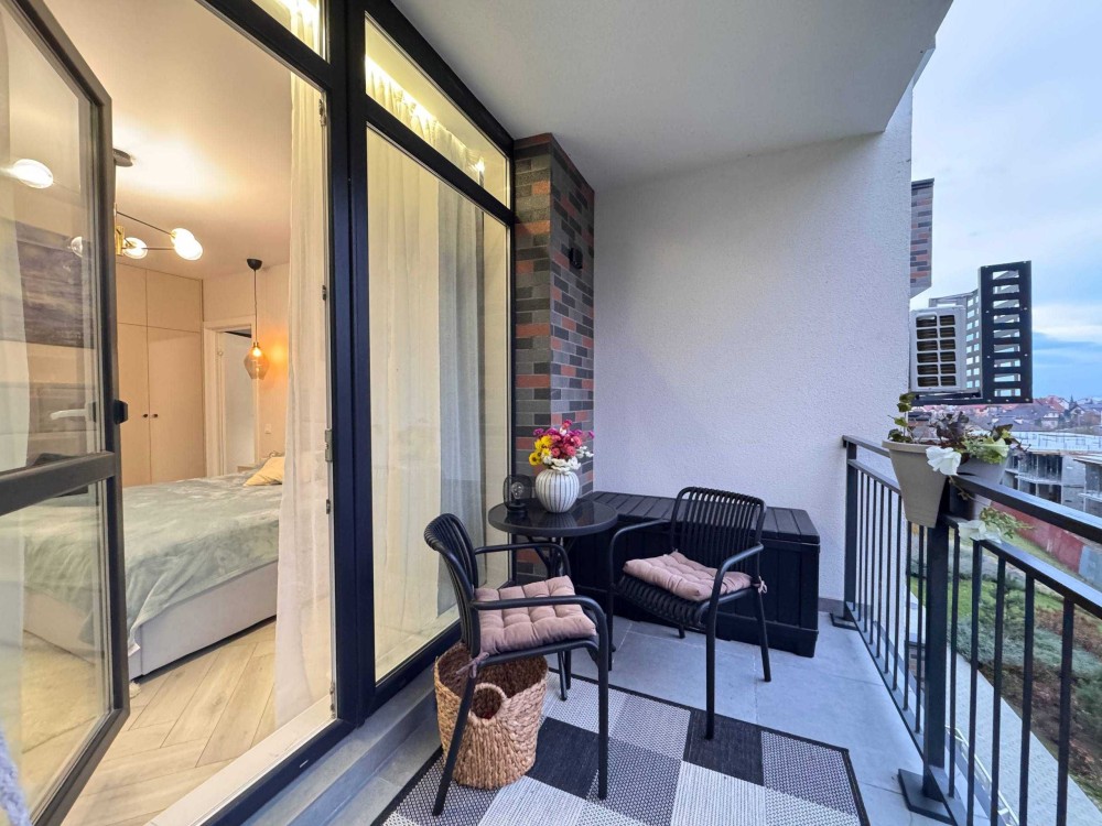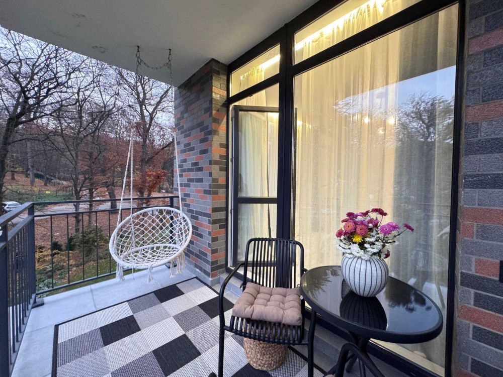 • Балкон з облаштуванням для відпочинку: столик, підвісне крісло-качалка