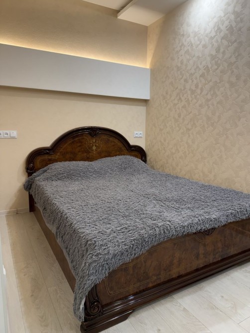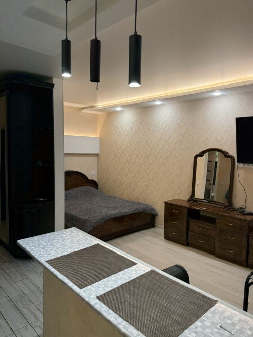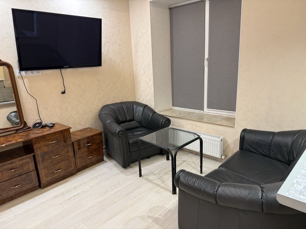 Спальня мебльована італійськими меблями високої якості. Диван та крісло виконані з натуральної шкіри, не замінник. Телевізор у відмінному стані, за потреби легко підключається Smart TV. Інтер’єр виглядає дорого та доглянуто.