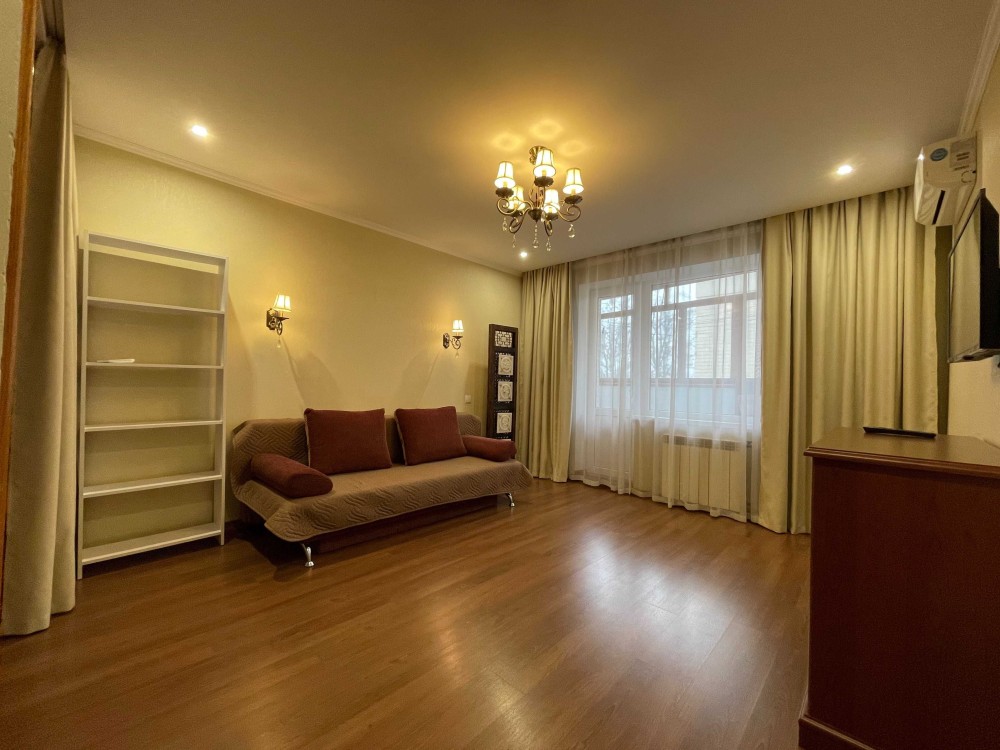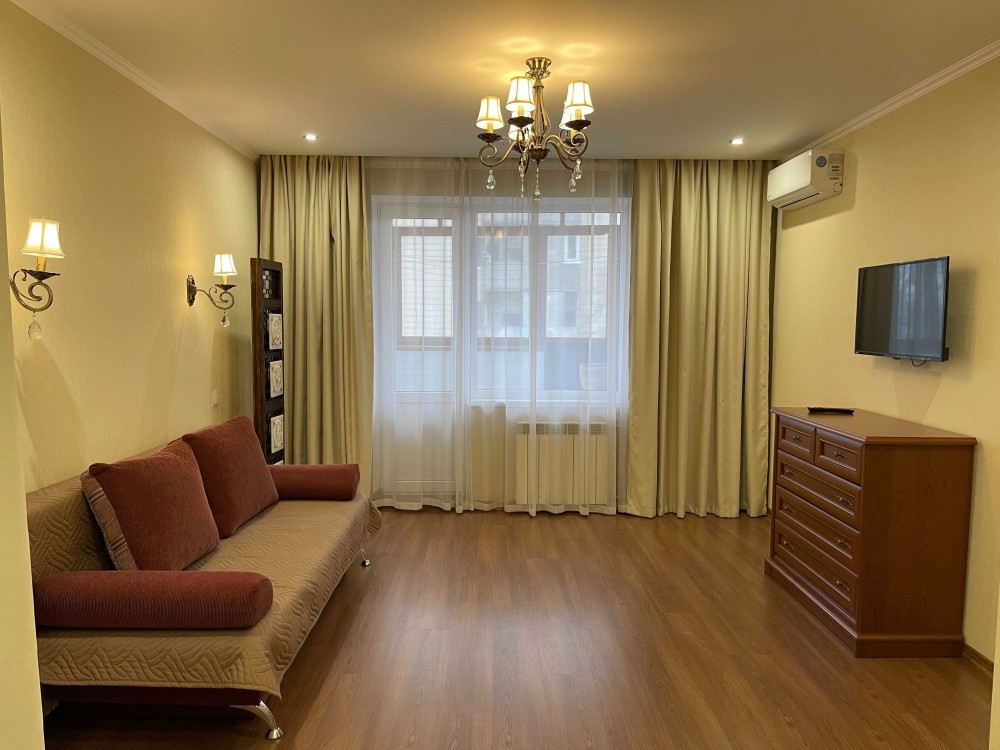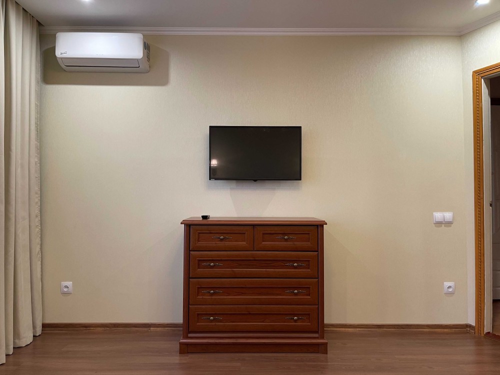 Квартира обладнана всім необхідним для проживання. В кімнаті – розкладний диван, шафа, комод, книжкова полиця. Є телевізор та для комфорту температури – кондиціонер.
