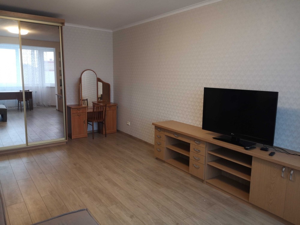 В кімнаті є шафа-купе, стіл, великий телевізор зі смарт, новий диван-трансформер.