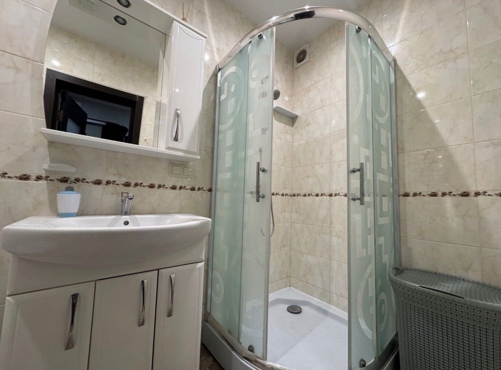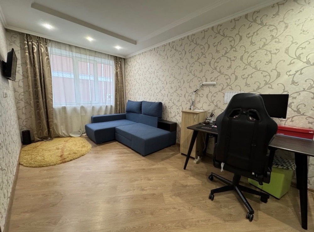 В окремій кімнаті розміщено розкладний диван, телевізор, робочу зону та містку шафу-купе, що забезпечує достатньо місця для зберігання речей.