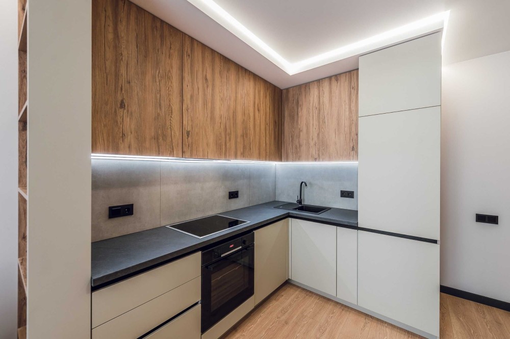 Кухня вітальня: вбудовані меблі, розкладний диван, кондиціонер, телевізор.