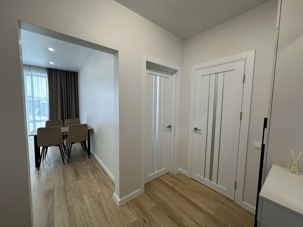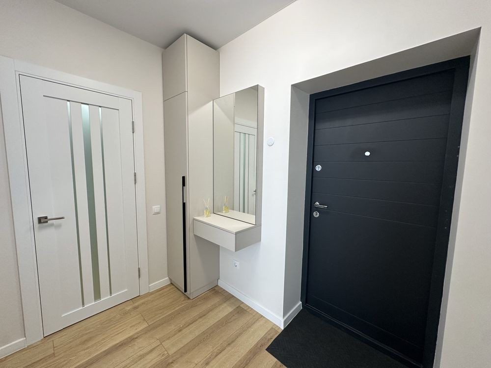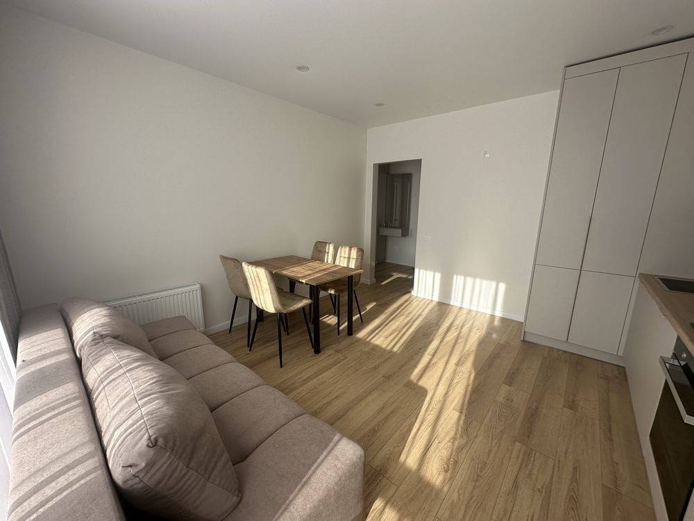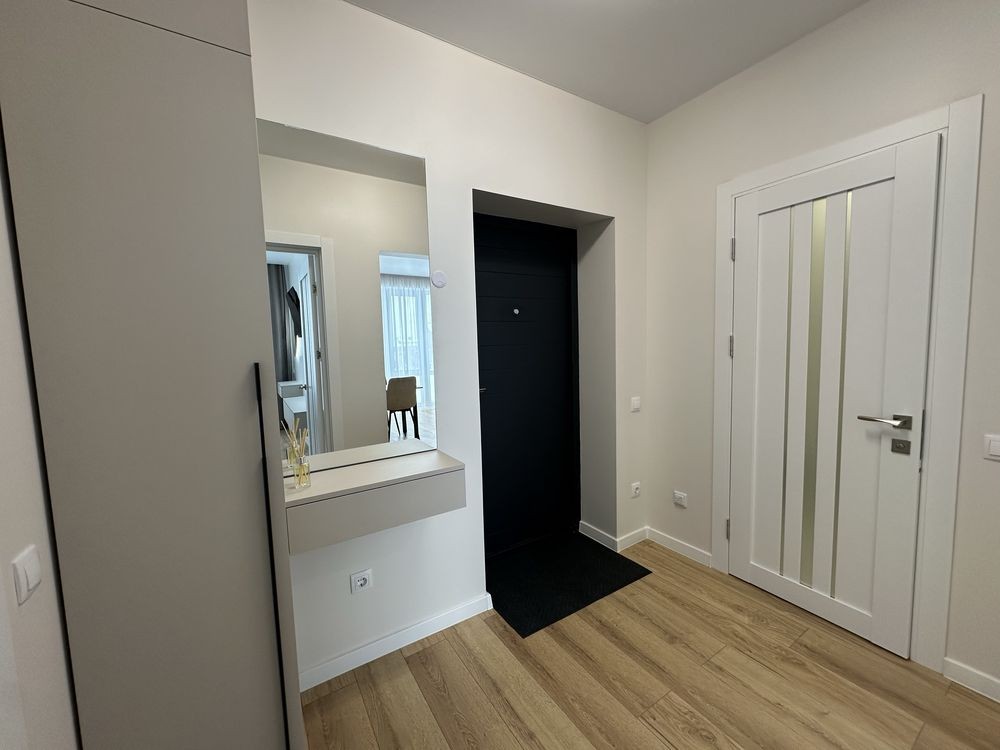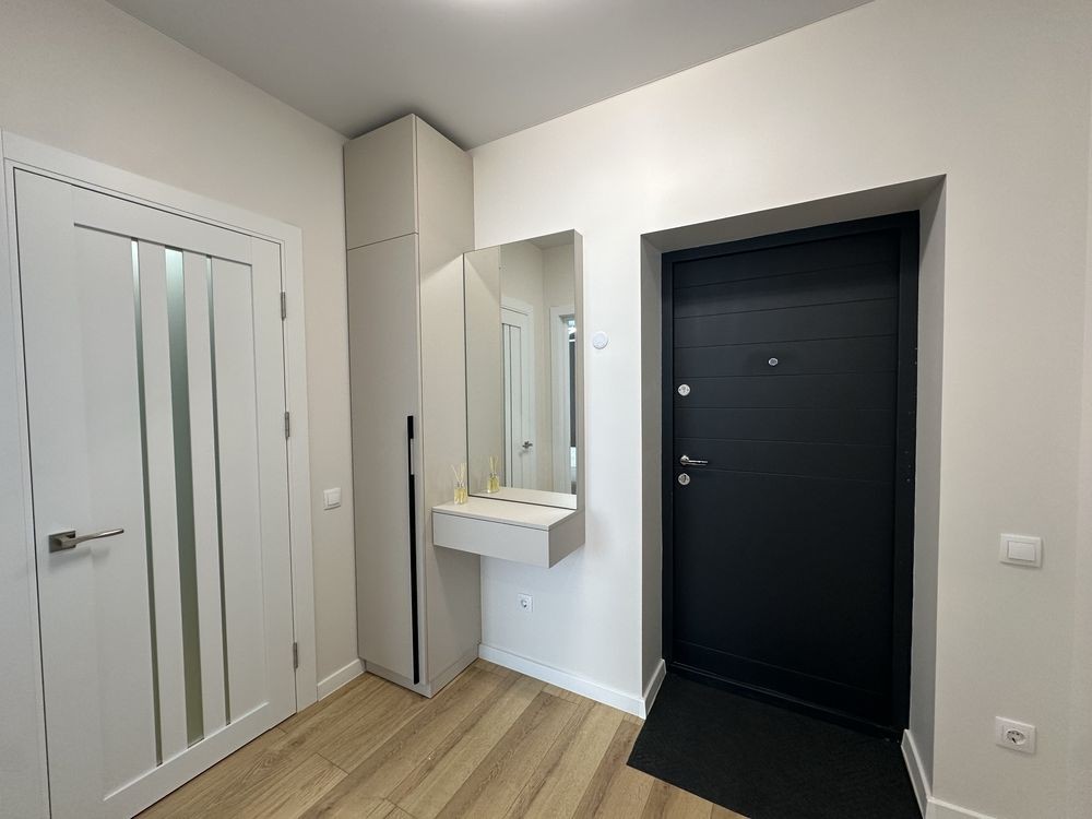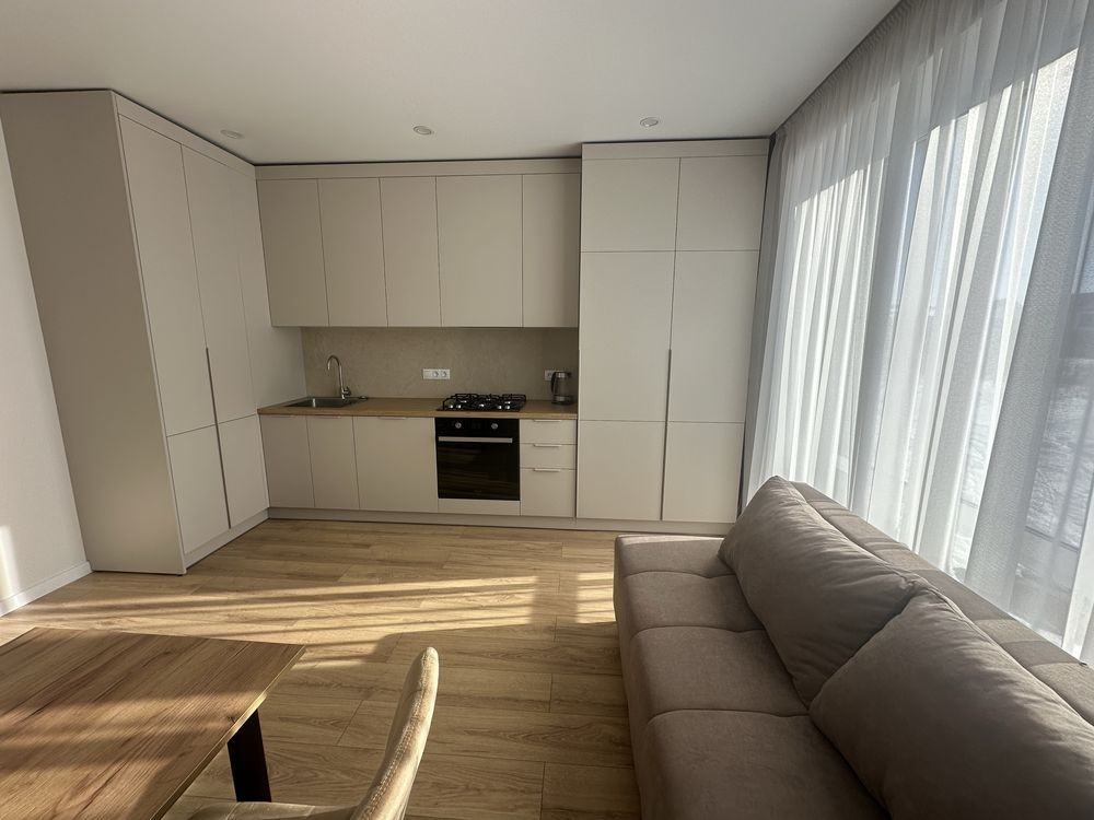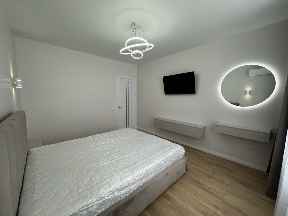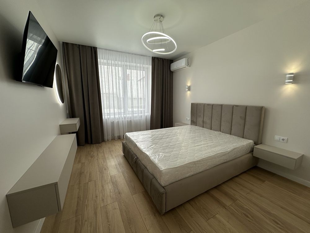Загальна площа -43м 2 , простора кухня-студія з диваном , окрема спальна кімната з двоспальним ліжком , гардеробна !!! , санвузол з ванною .