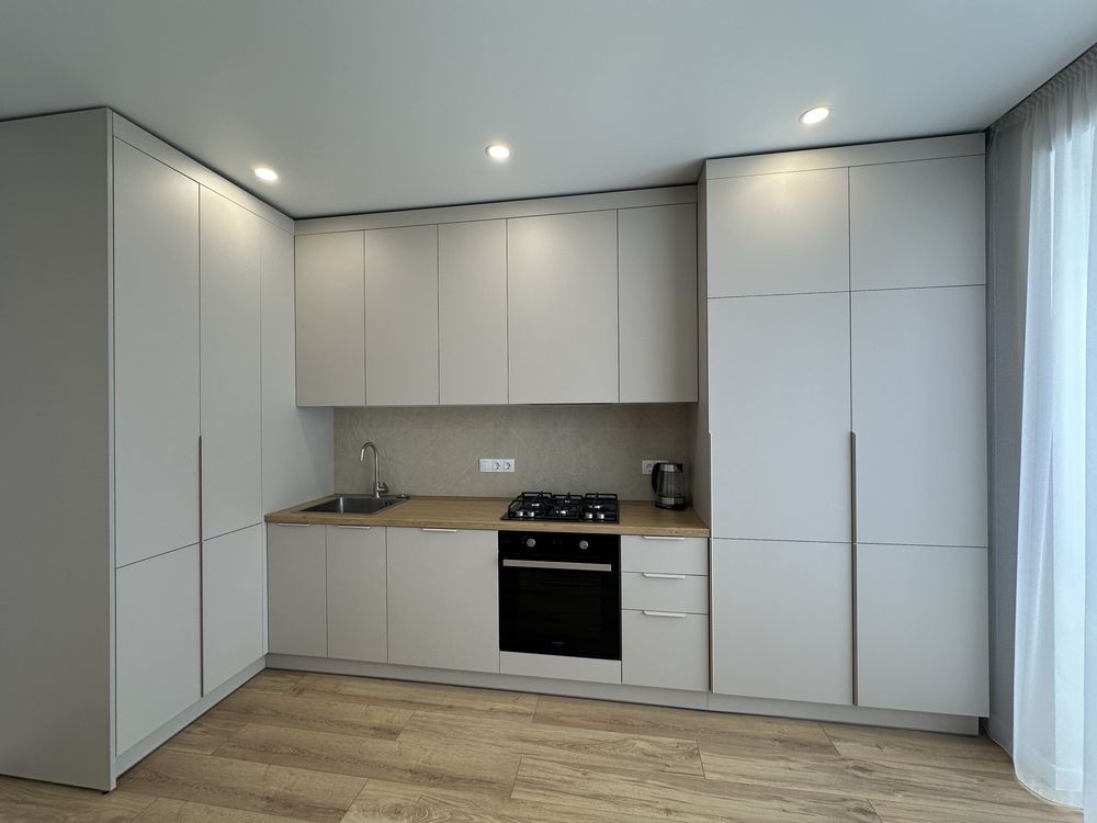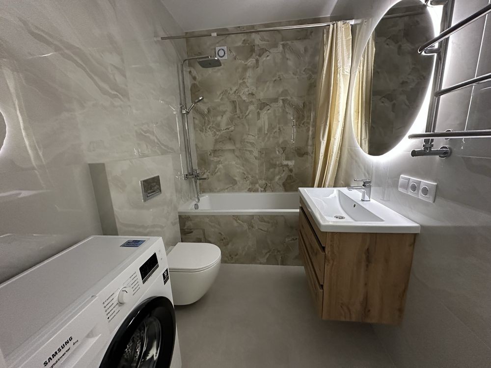 -Повністю укомплектована меблями та побутовою технікою ( вмонтовані холодильник , посудомийна машина , газова поверхня , витяжка , електрична духова шафа , мікрохвильовка , пральна -сушильна машина ).