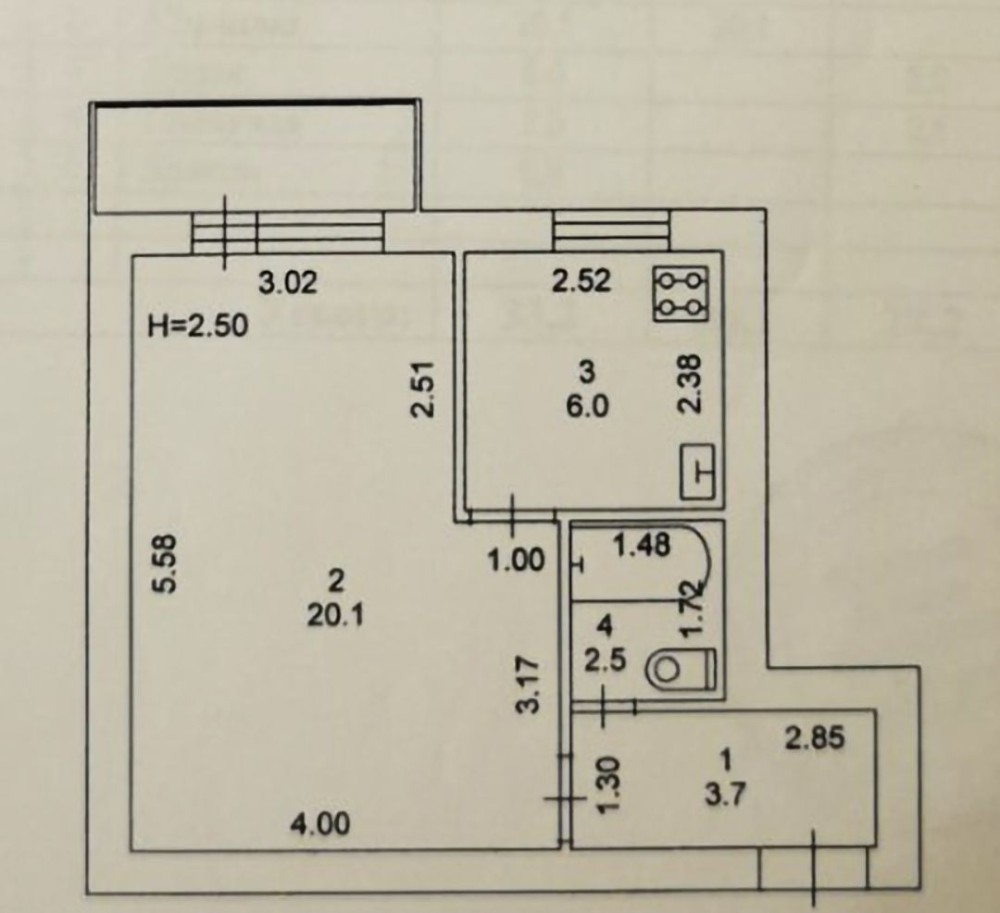 Загальна площа квартири - 33.2м² , кімната - 20.1м² , кухня -6м² .