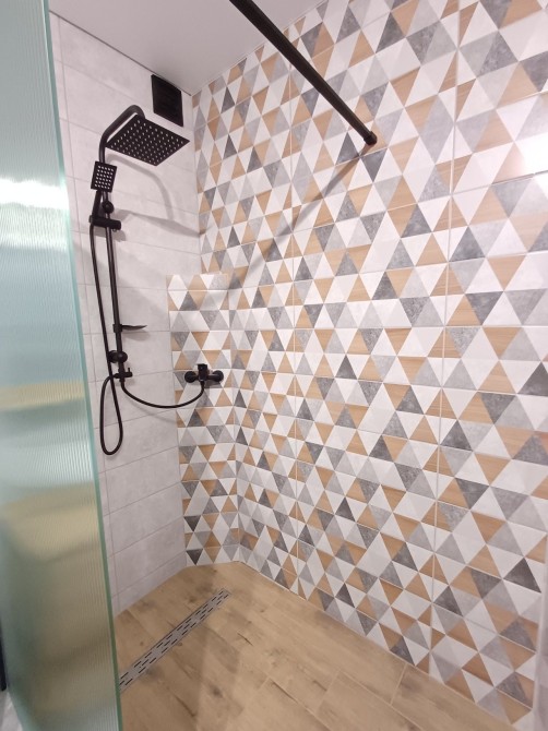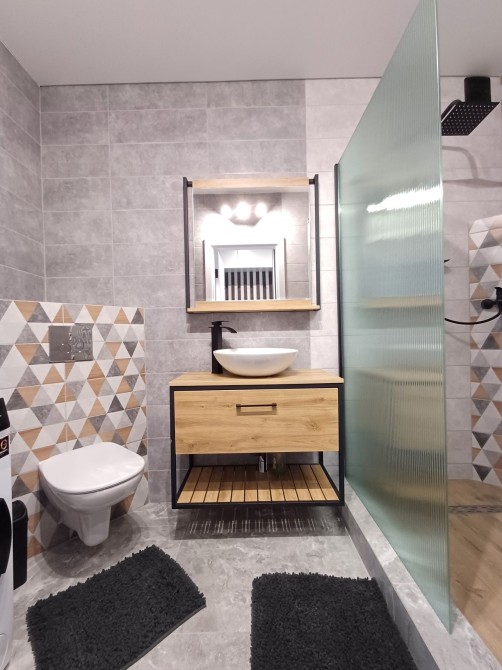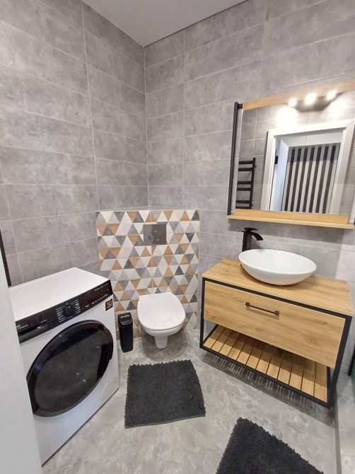 Санвузол сумісний, у світло-сірих тонах з мінімалістичною текстурою дерева. Підвісна сантехніка, підсвітка дзеркала, душова зона. Встановлена пральна машинка.