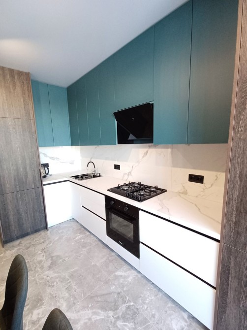 Світла, з панорамним вікном кухня, виконана в сучасному стилі. Є вбудований, прихованого монтажу холодильник, духова шафа, газова варильна поверхня. Обідня зона зі столом та стільцями.