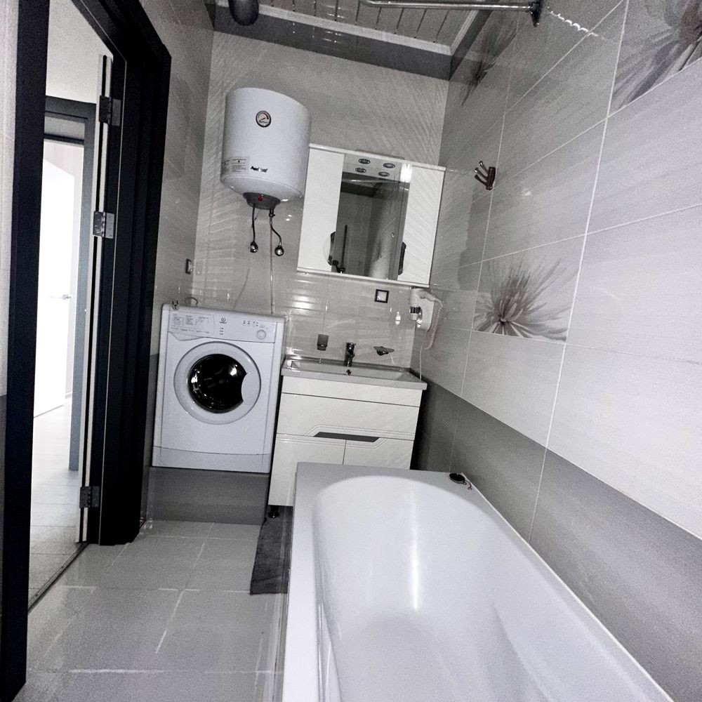 Є всі меблі та техніка: ліжко, диван, кондиціонер, бойлер, пральна та посудомийна машини, холодильник, газова плита, духова шафа, мікрохвильова піч.