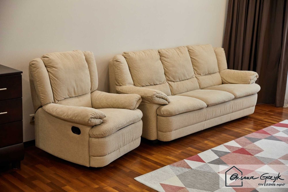 У вітальні м’яке крісло-реклайнер та комфортний диван – усе для відпочинку та перегляду фільмів удома.