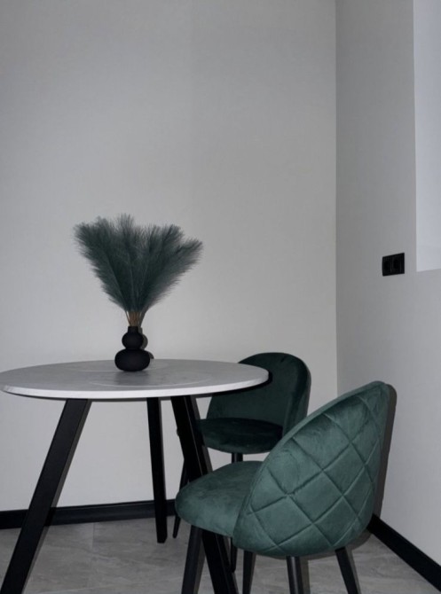 Ліжко вже встановлене, стіл на кухні зі стільцями, диванчик.